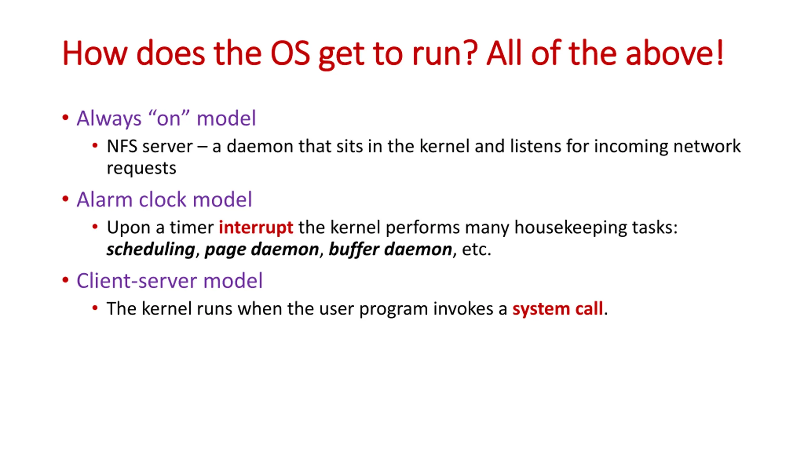 How does the OS get to run? All of the above! How does the OS get to run? All of the above! Always on model NFS server a daemon that sits in the kernel and listens for incoming network requests Alarm clock model Upon a timer interrupt the kernel performs many housekeeping tasks: scheduling, page daemon, buffer daemon, etc. Client-server model The kernel runs when the user program invokes a system call.