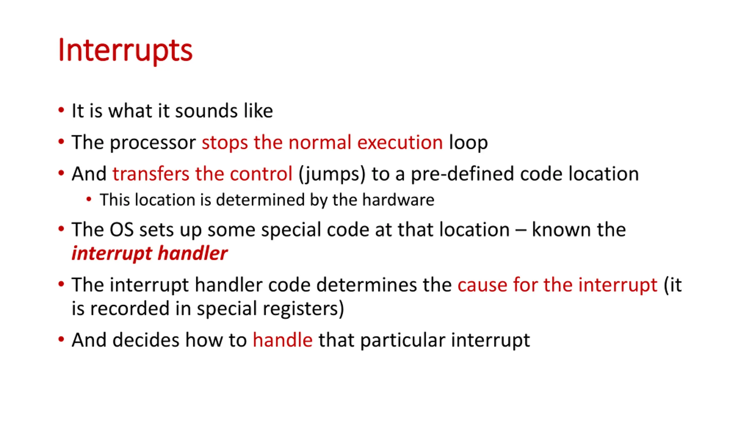 Interrupts Interrupts It is what it sounds like The processor stops the normal execution loop And transfers the control (jumps) to a pre-defined code location This location is determined by the hardware The OS sets up some special code at that location known the interrupt handler The interrupt handler code determines the cause for the interrupt (it is recorded in special registers) And decides how to handle that particular interrupt