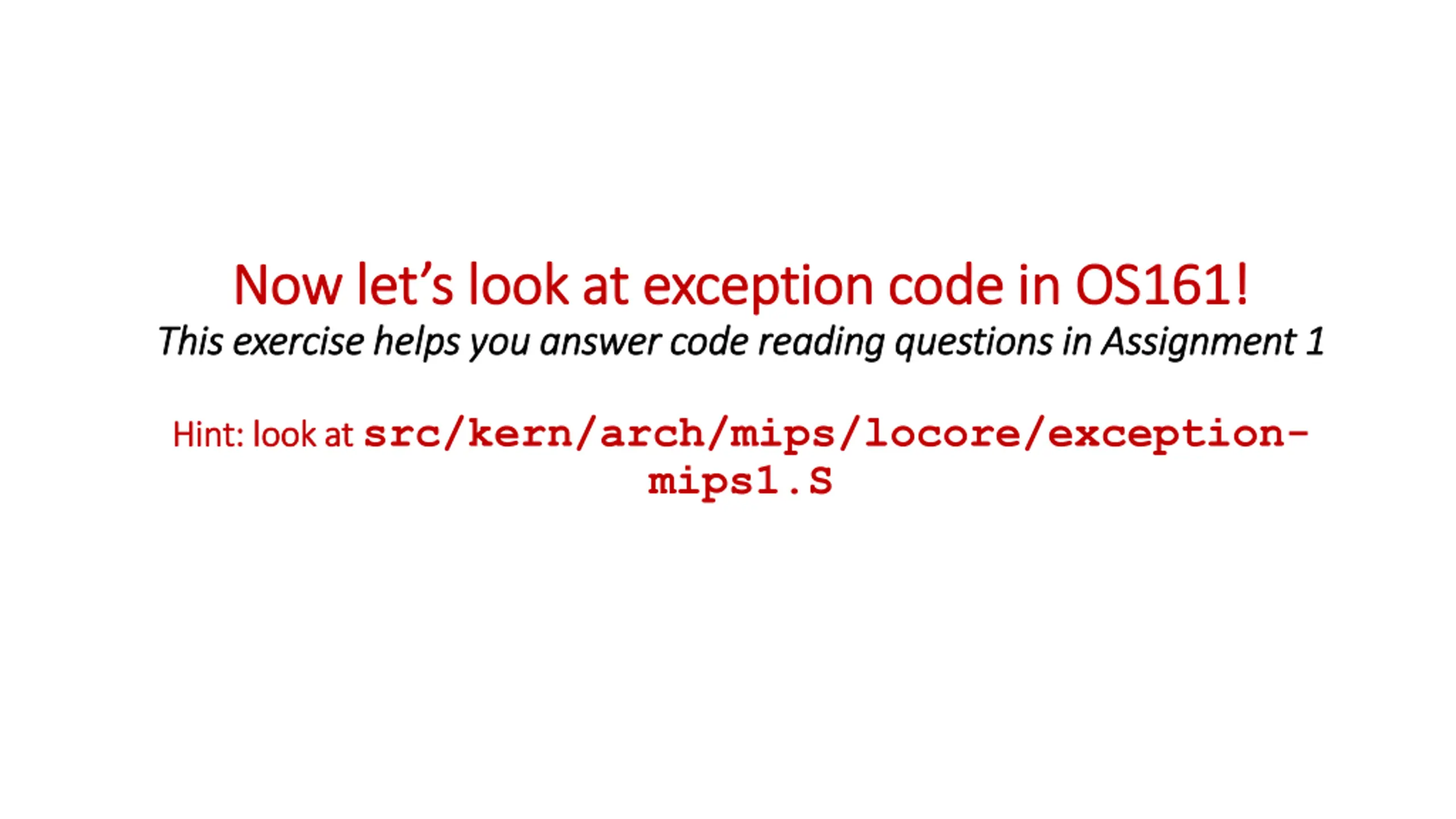Now lets look at exception code in OS161! Now let s look at exception code in OS161! This exercise helps you answer code reading questions in Assignment 1 This exercise helps you answer code reading questions in Assignment 1 Hint: look at Hint: look at src/kern/arch/mips/locore/exception- mips1.S