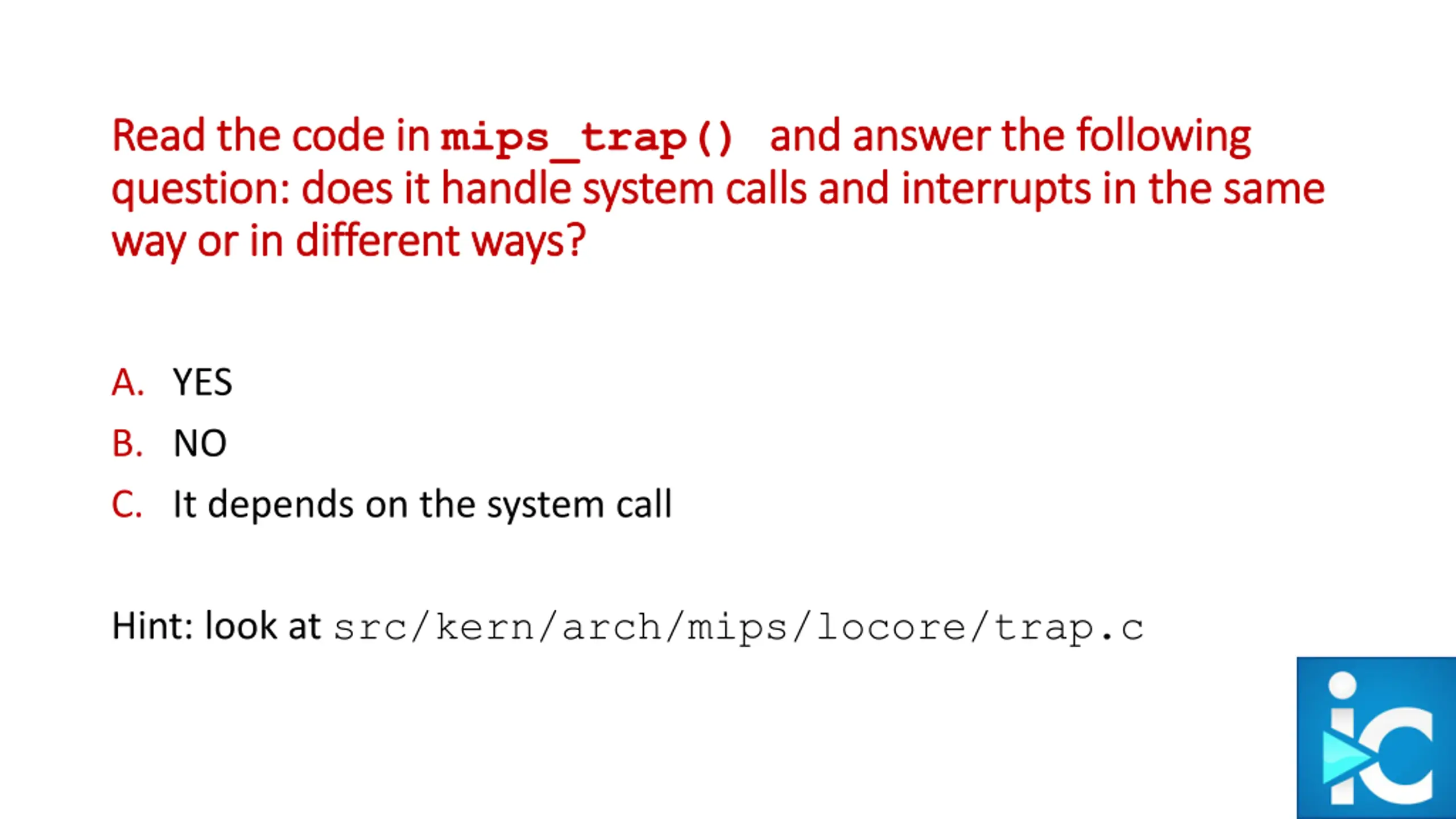 to mips_trap() Does the exception code executed Does the exception code executed prior handle system calls and interrupts in the same way or in different handle system calls and interrupts in the same way or in different ways ways? ? prior to A. YES B. NO C. It depends on the system call Hint: look at src/kern/arch/mips/locore/exception-mips1.S