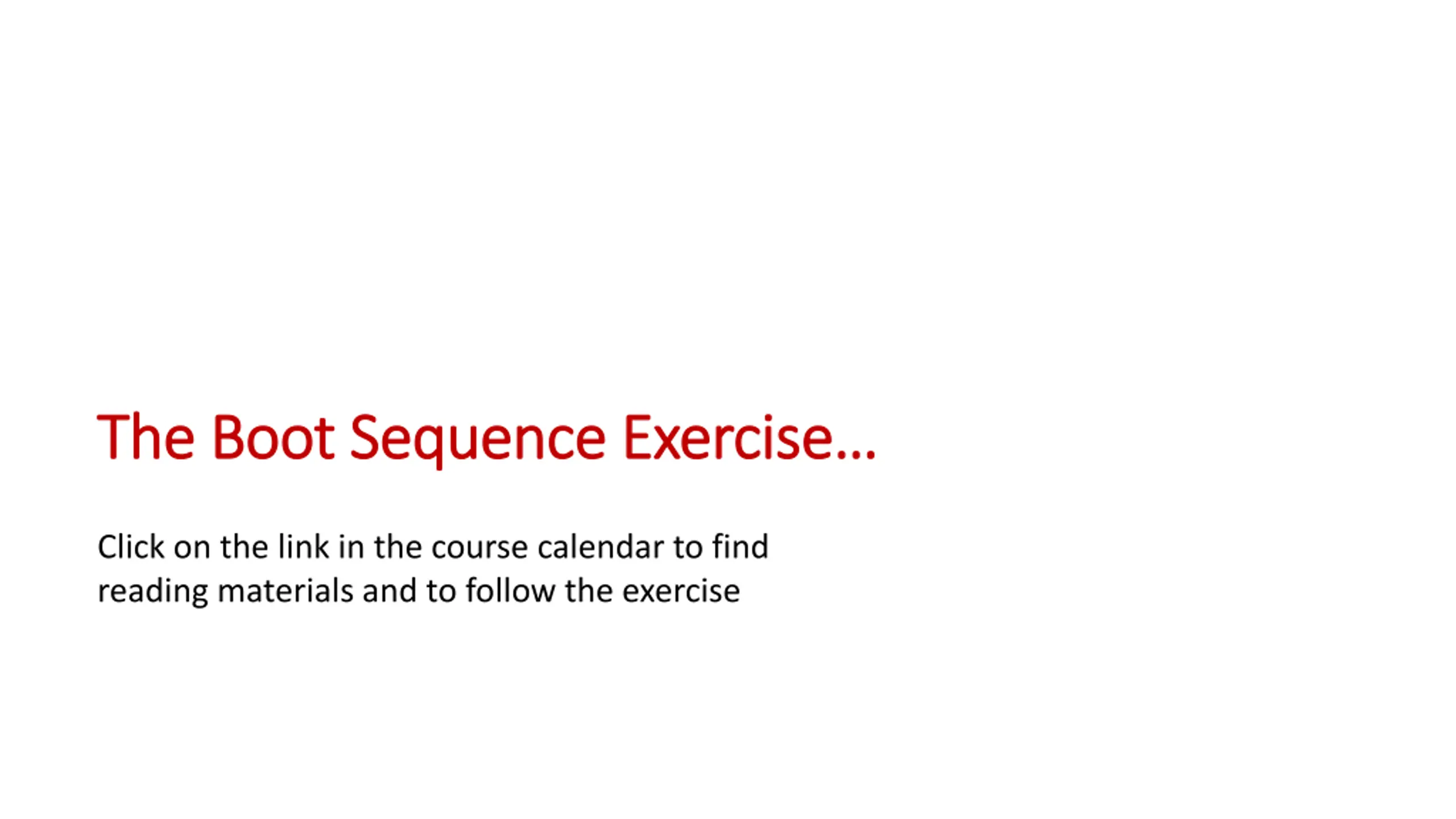 The Boot Sequence Exercise The Boot Sequence Exercise Click on the link in the course calendar to find reading materials and to follow the exercise