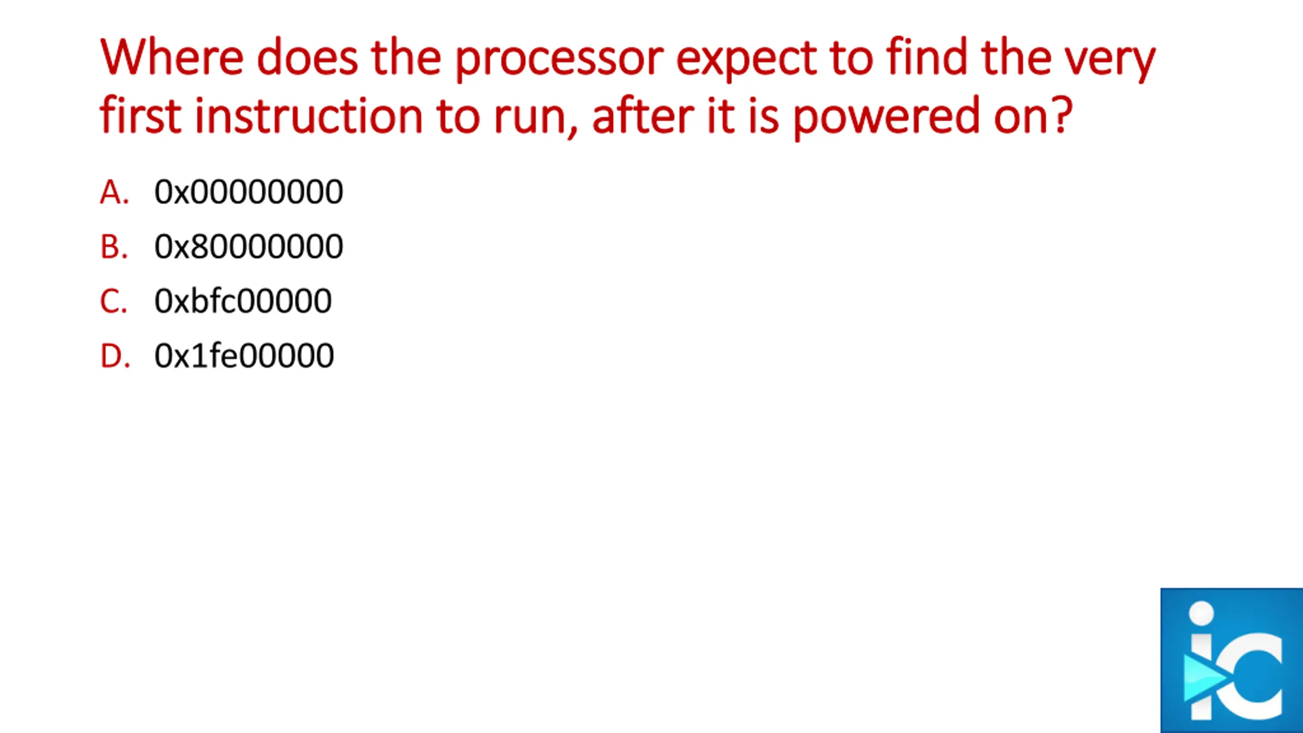 Where does the processor expect to find the very Where does the processor expect to find the very first instruction to run, after it is powered on? first instruction to run, after it is powered on? A. 0x00000000 B. 0x80000000 C. 0xbfc00000 D. 0x1fe00000