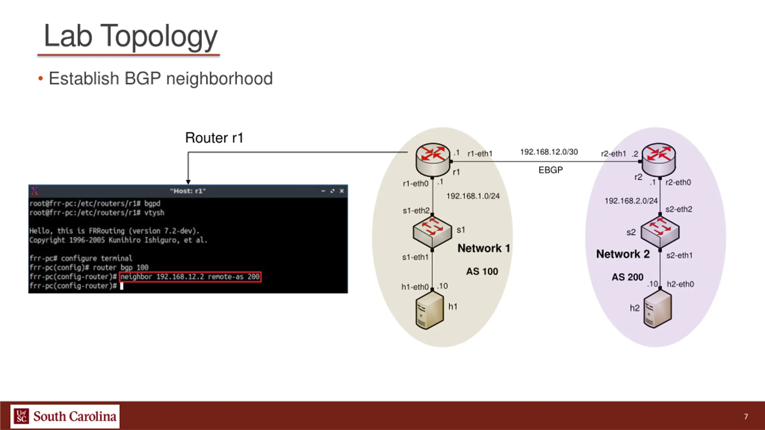 Lab Topology BGP table: lists the routes learned from BGP routing protocol Router r2 192.168.12.0/30 .1 r1-eth1 r2-eth1 .2 EBGP r1 r2 .1 .1 r2-eth0 r1-eth0 192.168.1.0/24 192.168.2.0/24 s2-eth2 s1-eth2 s1 s2 Network 1 Network 2 s2-eth1 s1-eth1 AS 100 AS 200 .10 h2-eth0 .10 h1-eth0 h1 h2 10