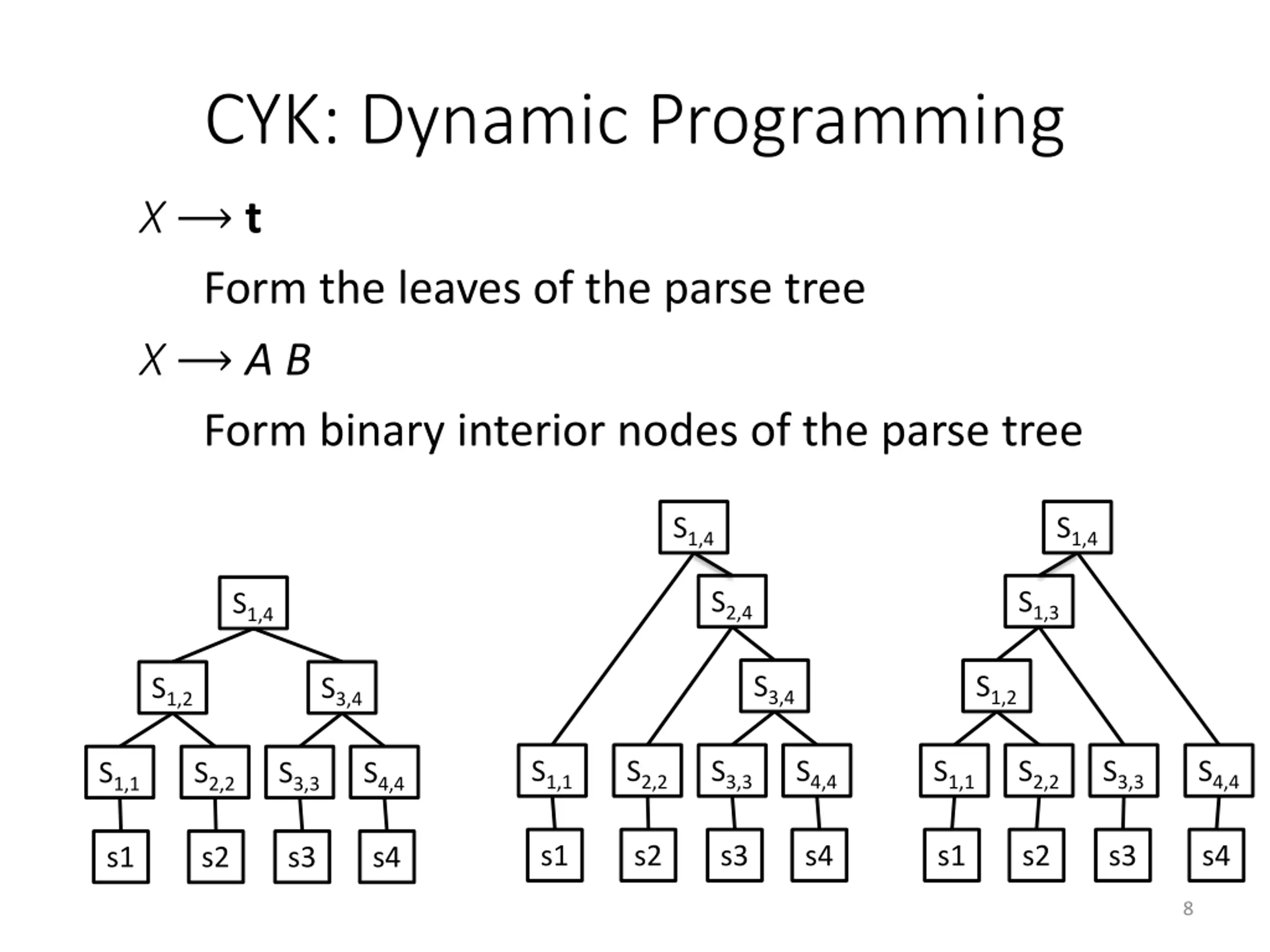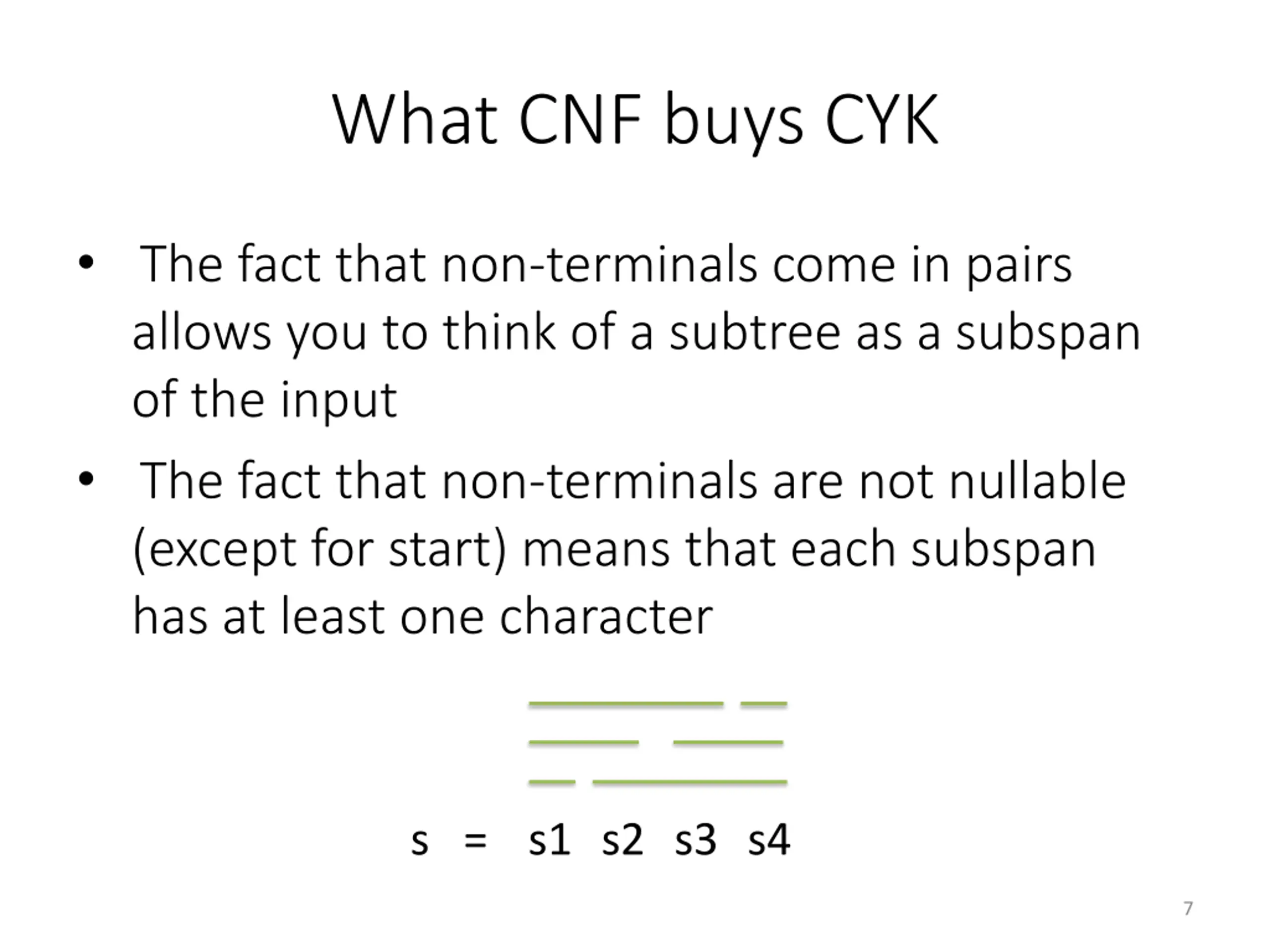 What CNF buys CYK The fact that non-terminals come in pairs allows you to think of a subtree as a subspan of the input The fact that non-terminals are not nullable (except for start) means that each subspan has at least one character s = s1 s2 s3 s4 7