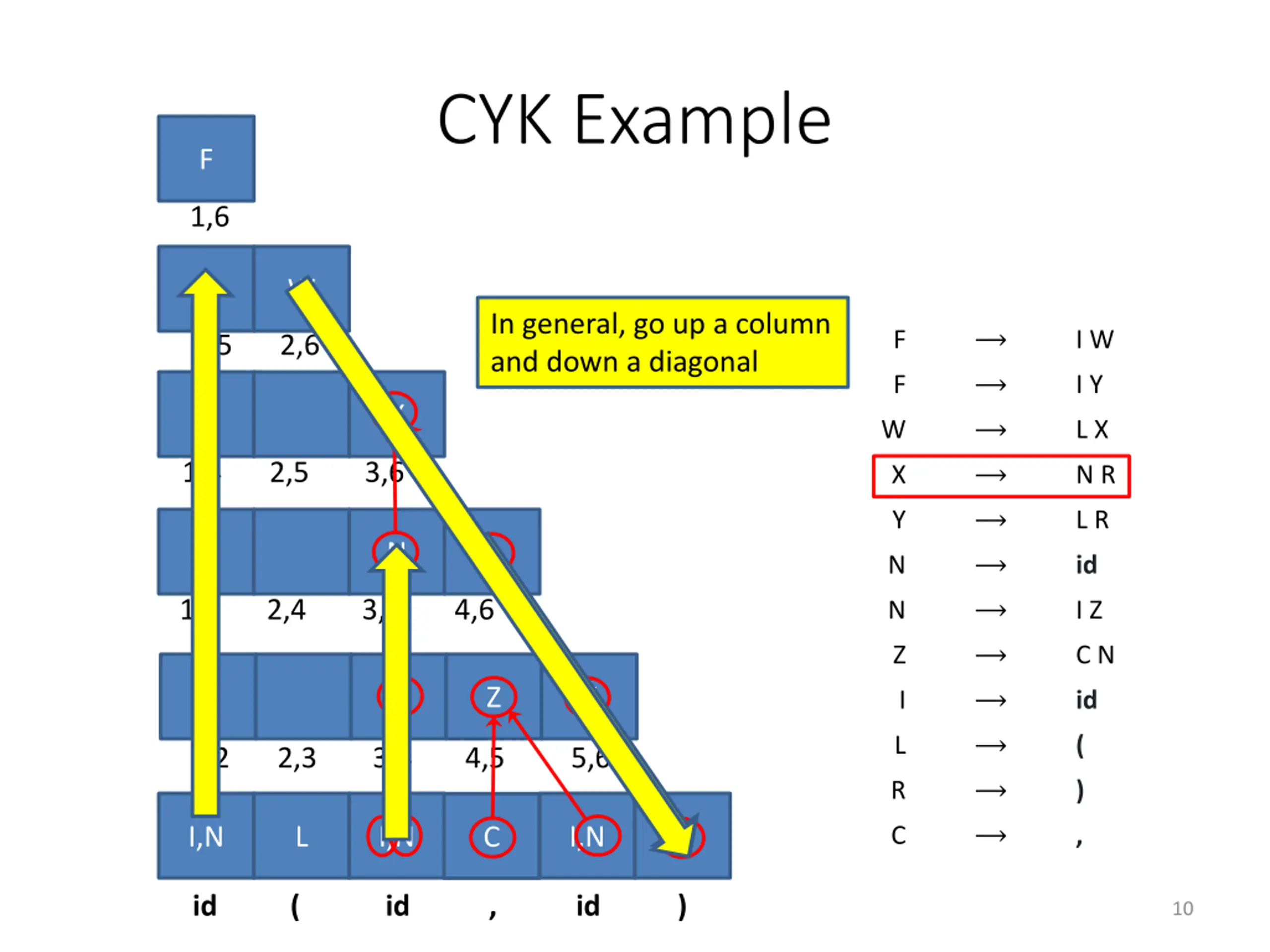 CYK Example F 1,6 F I W W F I Y W L X 2,6 X N R X Y L R 3,6 N id N I Z N Z C N 3,5 I id L ( Z R ) 4,5 C , I,N L I,N C N R id ( id , id ) 12
