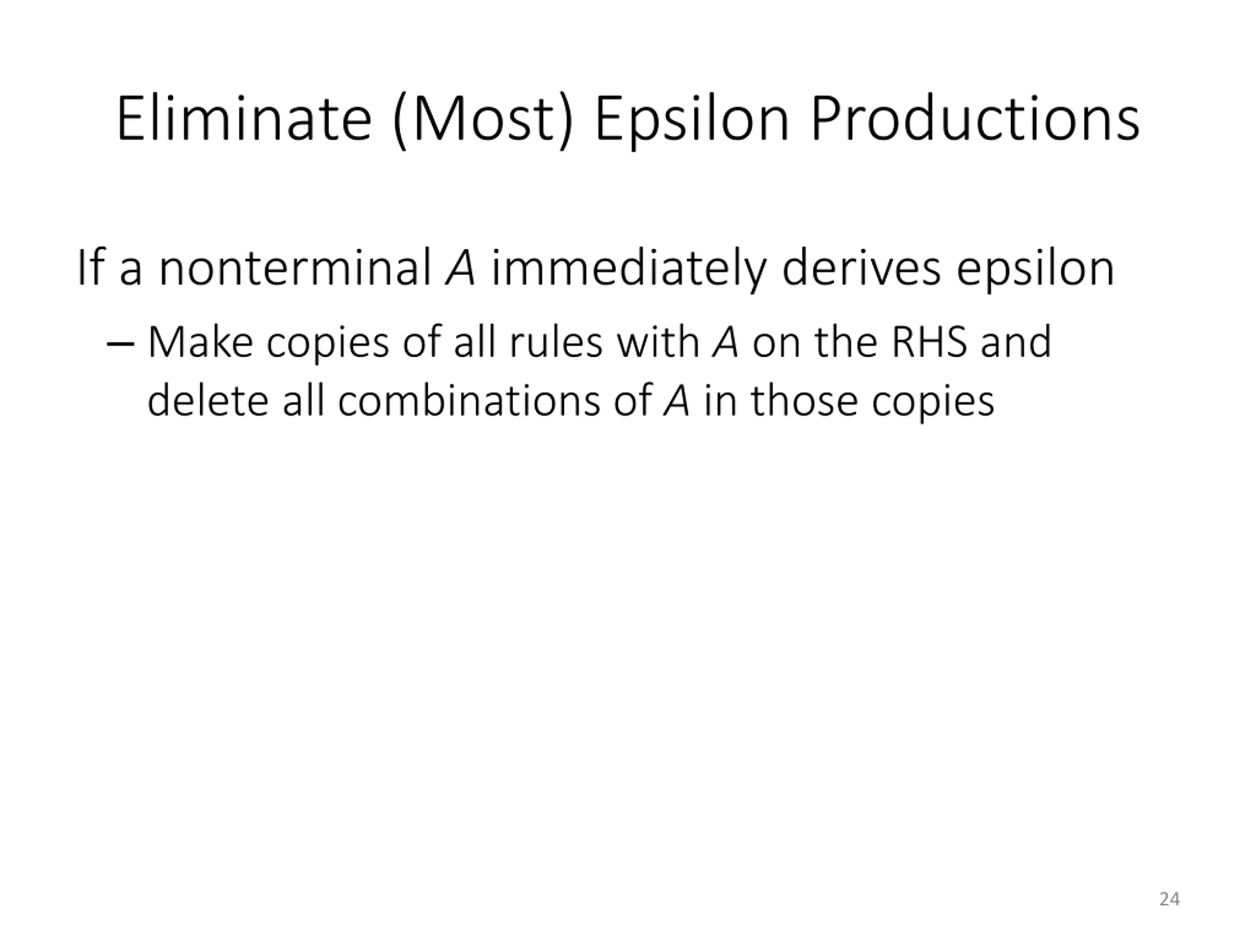 Eliminate (Most) Epsilon Productions If a nonterminal A immediately derives epsilon Make copies of all rules with A on the RHS and delete all combinations of A in those copies 24