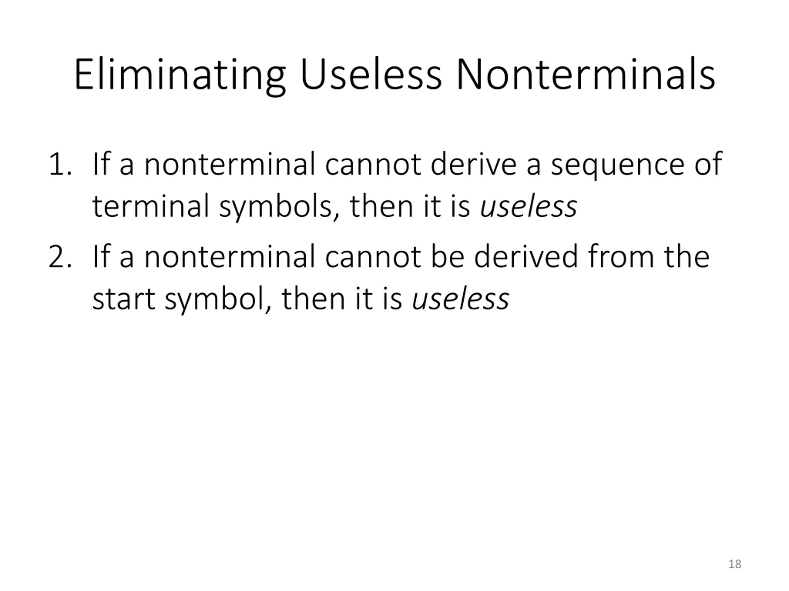 Eliminating Useless Nonterminals 1. If a nonterminal cannot derive a sequence of terminal symbols, then it is useless 2. If a nonterminal cannot be derived from the start symbol, then it is useless 18