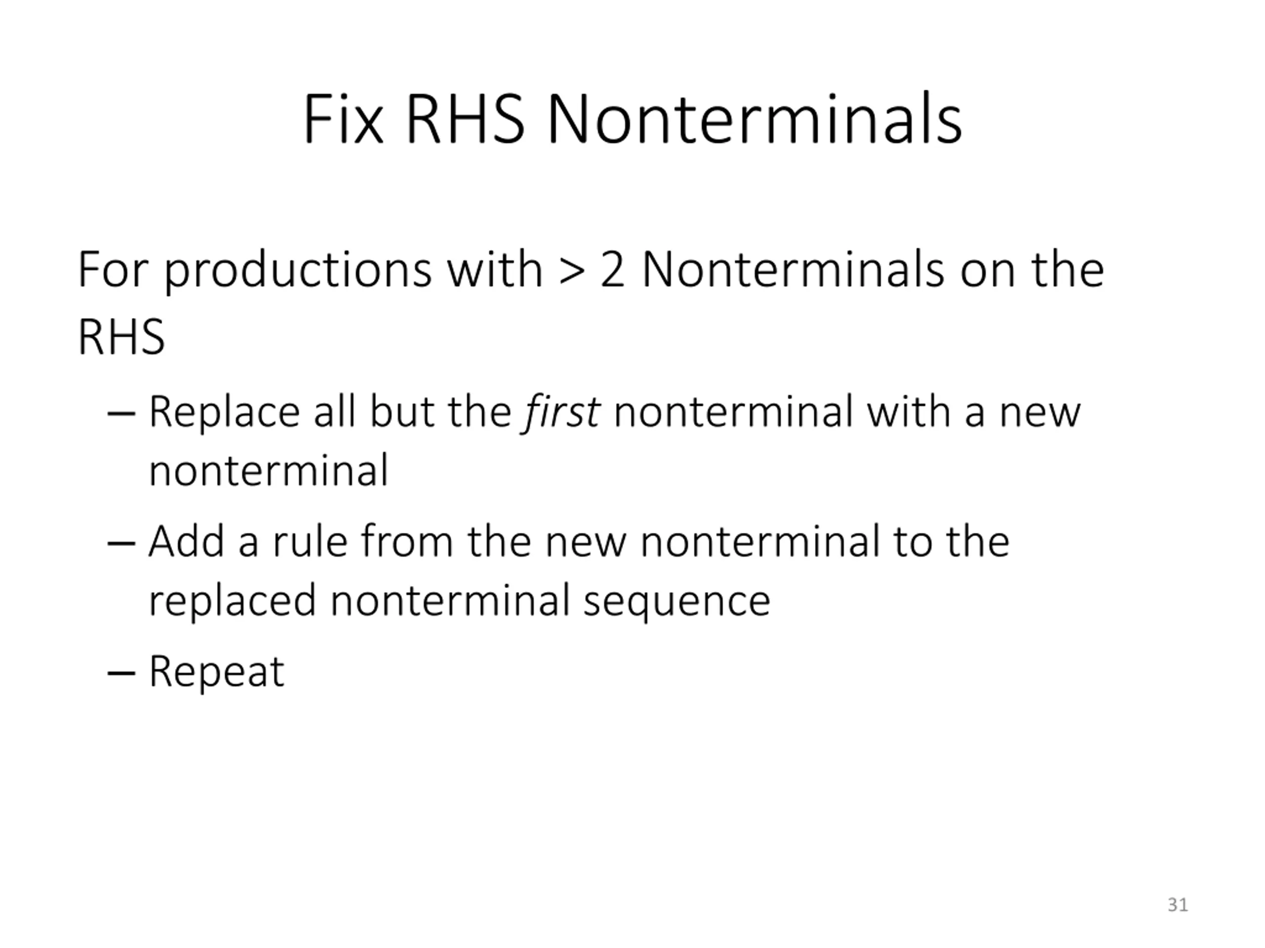 Fix RHS Nonterminals For productions with > 2 Nonterminals on the RHS Replace all but the first nonterminal with a new nonterminal Add a rule from the new nonterminal to the replaced nonterminal sequence Repeat 31