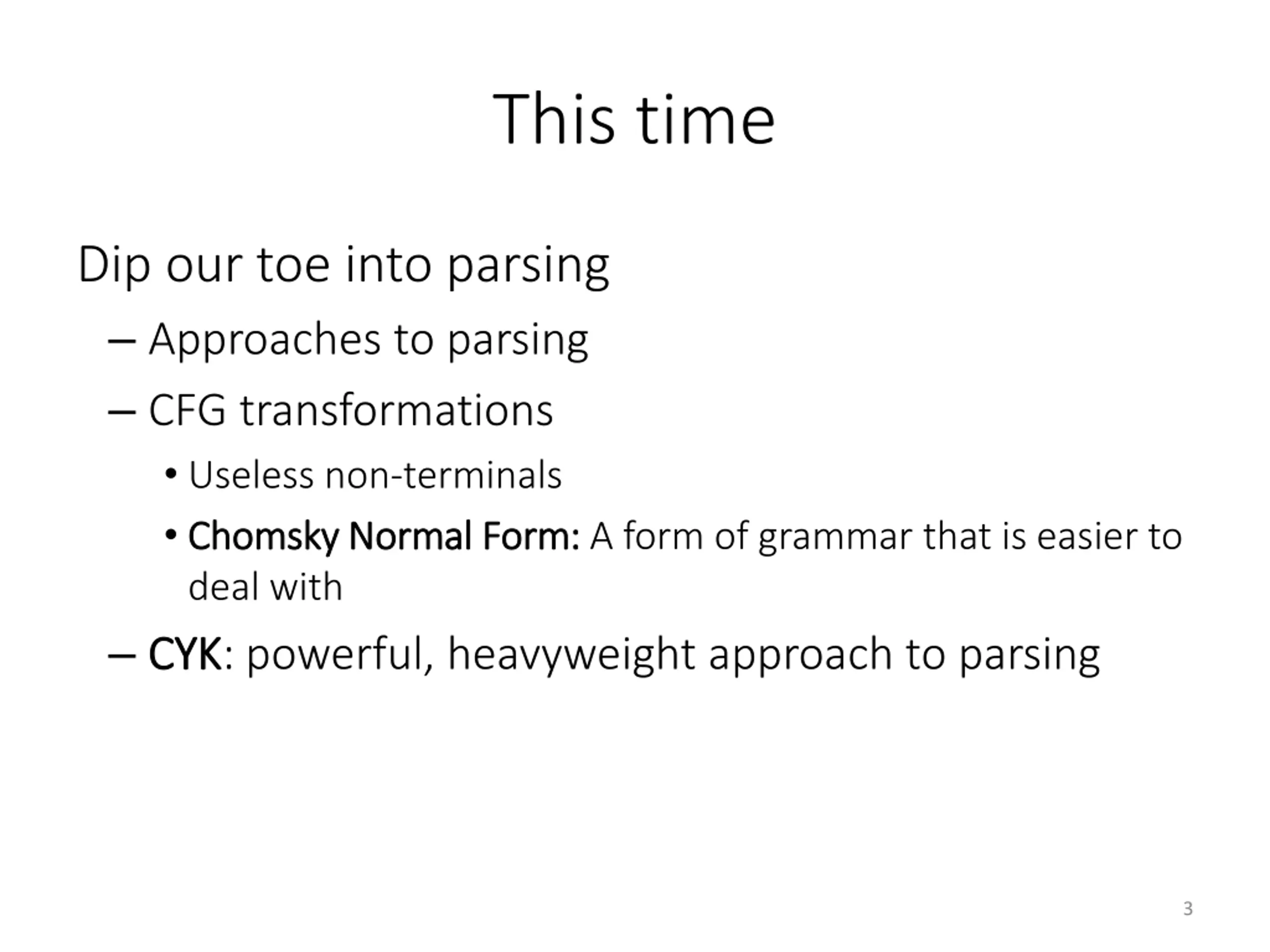 This time Dip our toe into parsing Approaches to parsing CFG transformations Useless non-terminals Chomsky Normal Form: Chomsky Normal Form: A form of grammar that is easier to deal with CYK CYK: powerful, heavyweight approach to parsing 3