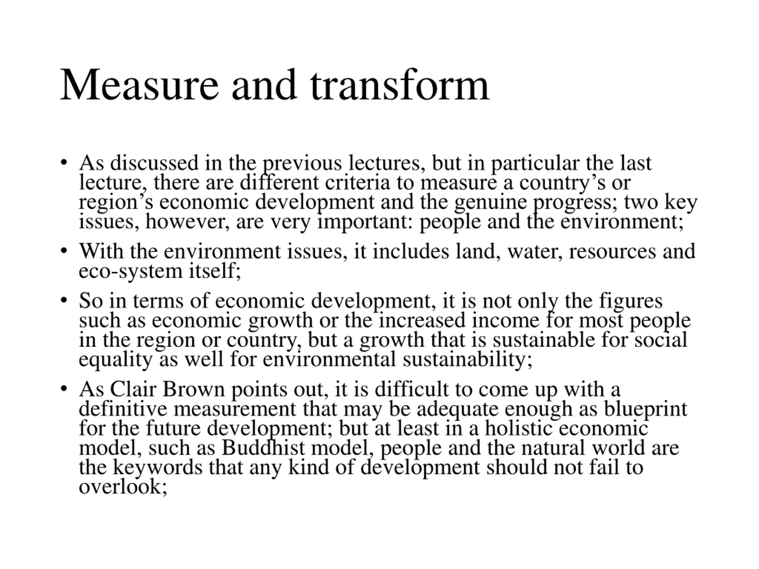 Measure and transform As discussed in the previous lectures, but in particular the last lecture, there are different criteria to measure a country s or region s economic development and the genuine progress; two key issues, however, are very important: people and the environment; With the environment issues, it includes land, water, resources and eco-system itself; So in terms of economic development, it is not only the figures such as economic growth or the increased income for most people in the region or country, but a growth that is sustainable for social equality as well for environmental sustainability; As Clair Brown points out, it is difficult to come up with a definitive measurement that may be adequate enough as blueprint for the future development; but at least in a holistic economic model, such as Buddhist model, people and the natural world are the keywords that any kind of development should not fail to overlook;