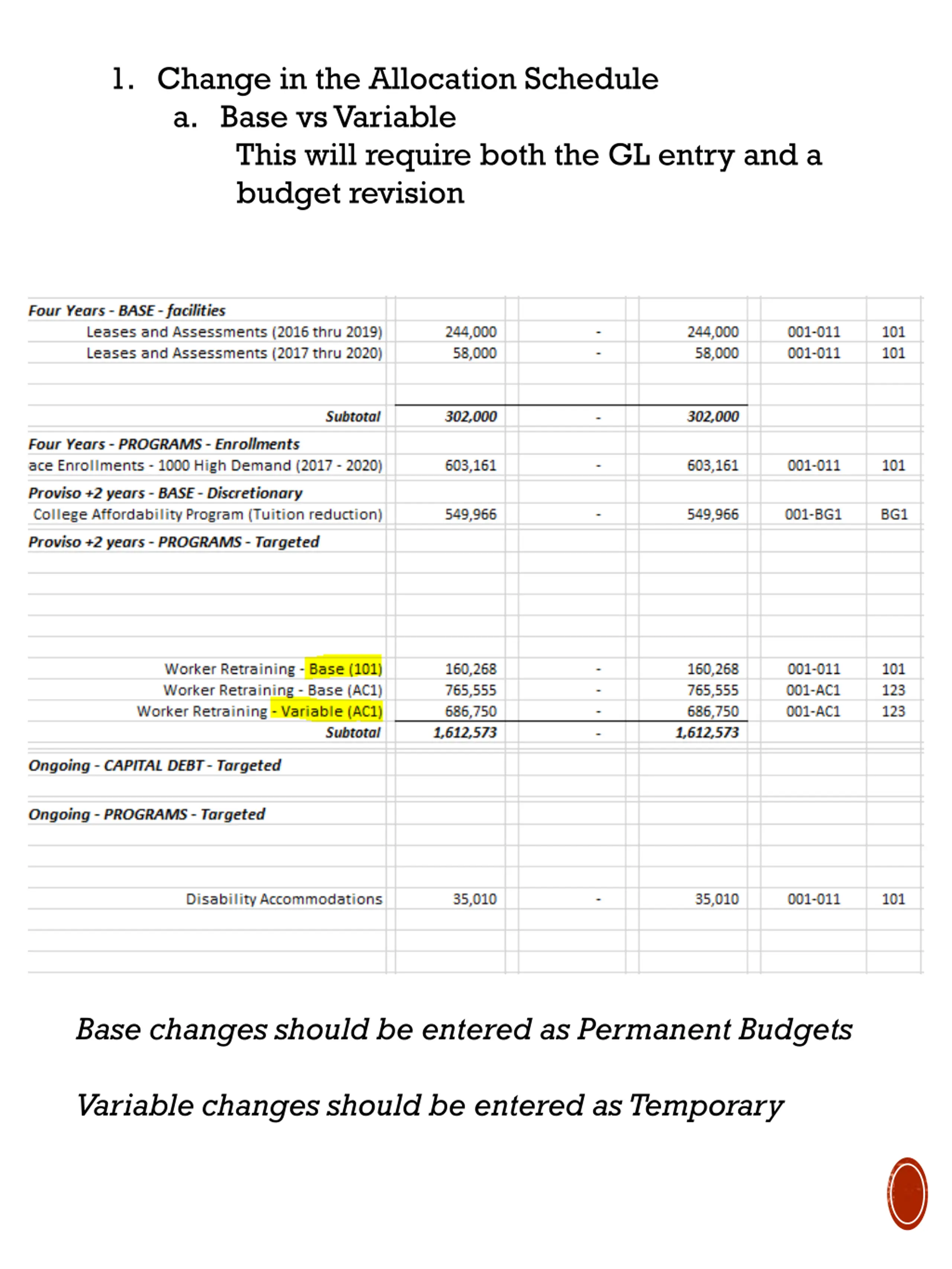 1. Change in the Allocation Schedule a. Base vs Variable This will require both the GL entry and a budget revision Base changes should be entered as Permanent Budgets Variable changes should be entered as Temporary