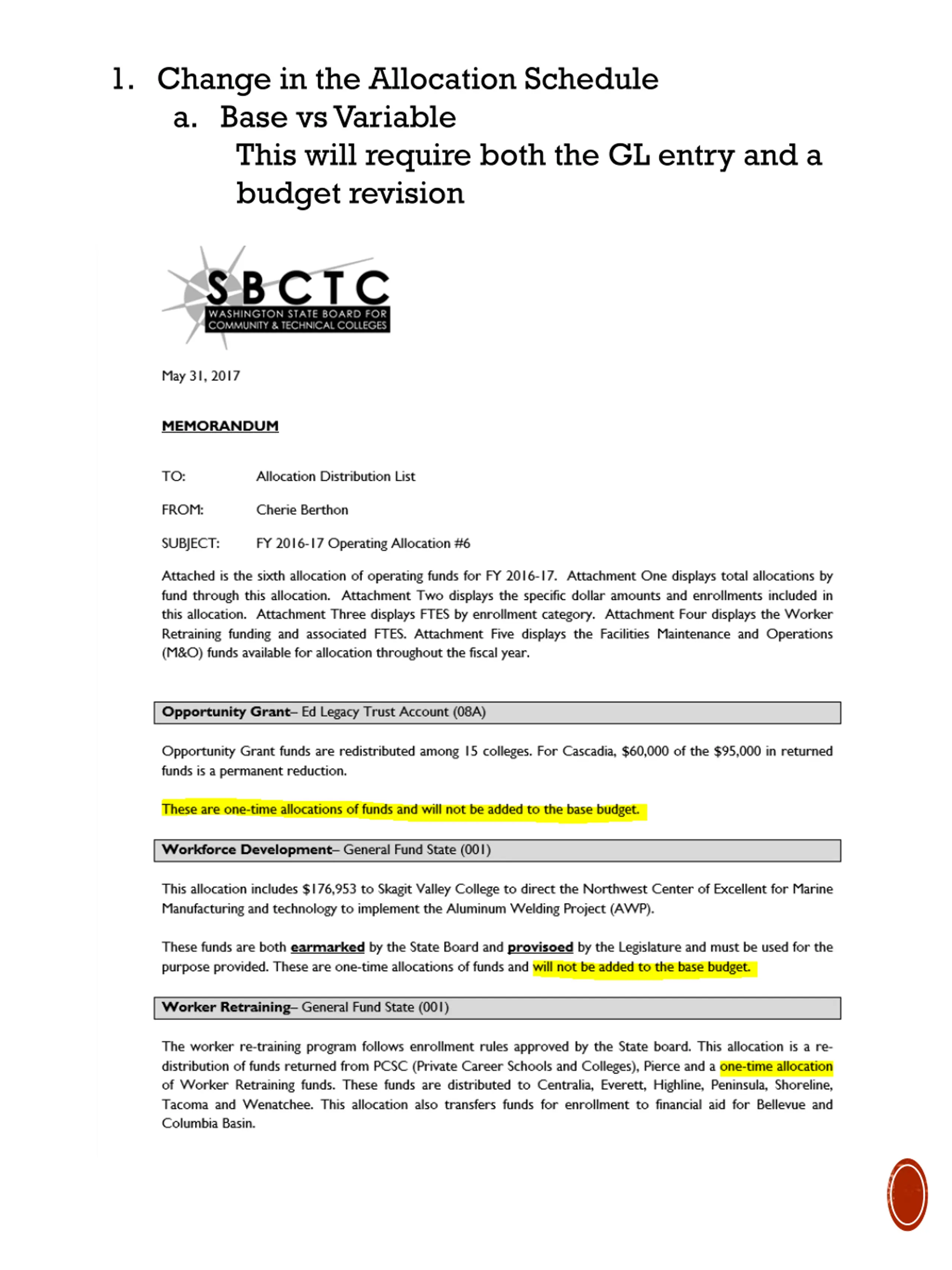 1. Change in the Allocation Schedule a. Base vs Variable This will require both the GL entry and a budget revision