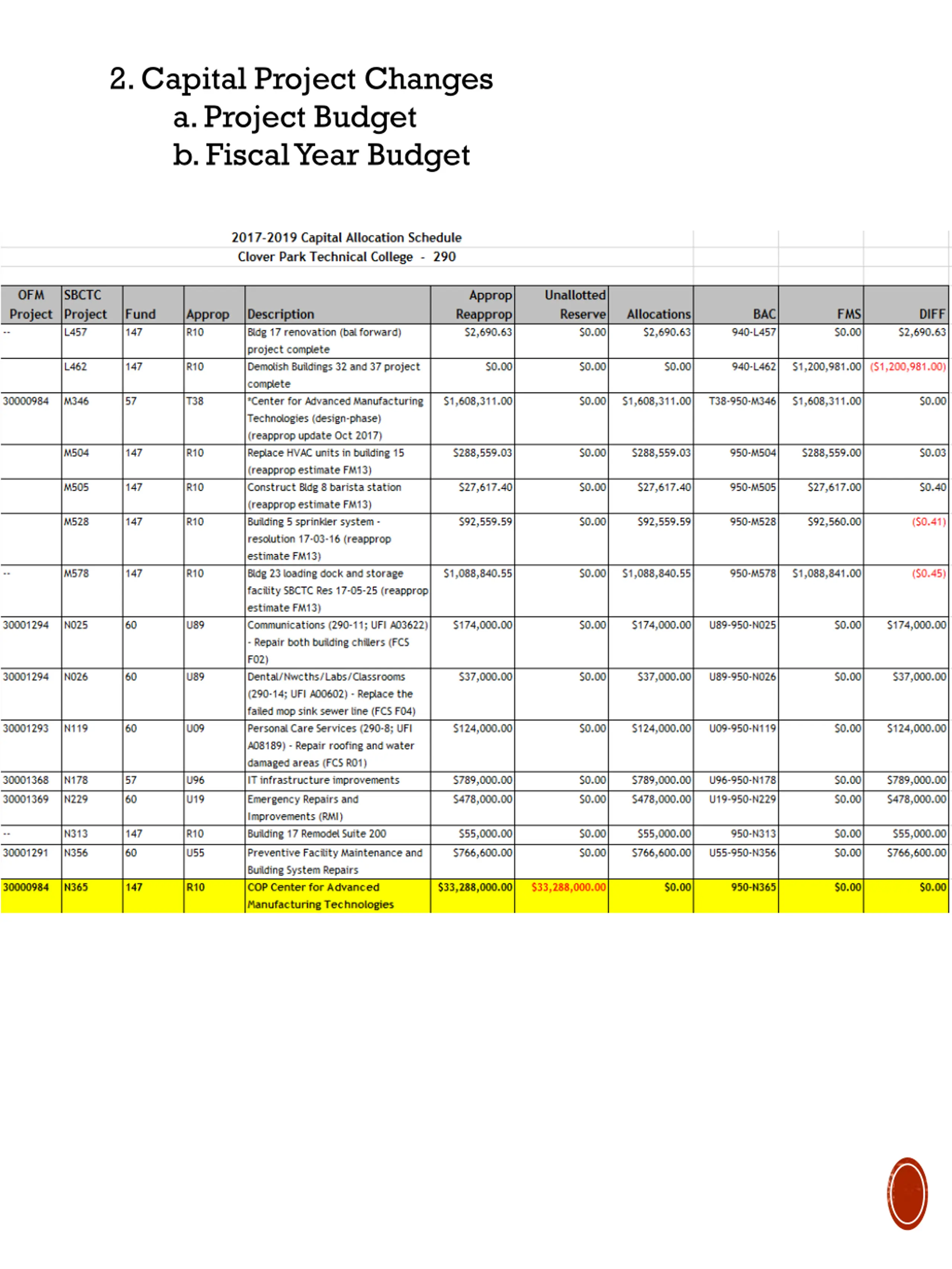 2. Capital Project Changes a. Project Budget b. Fiscal Year Budget