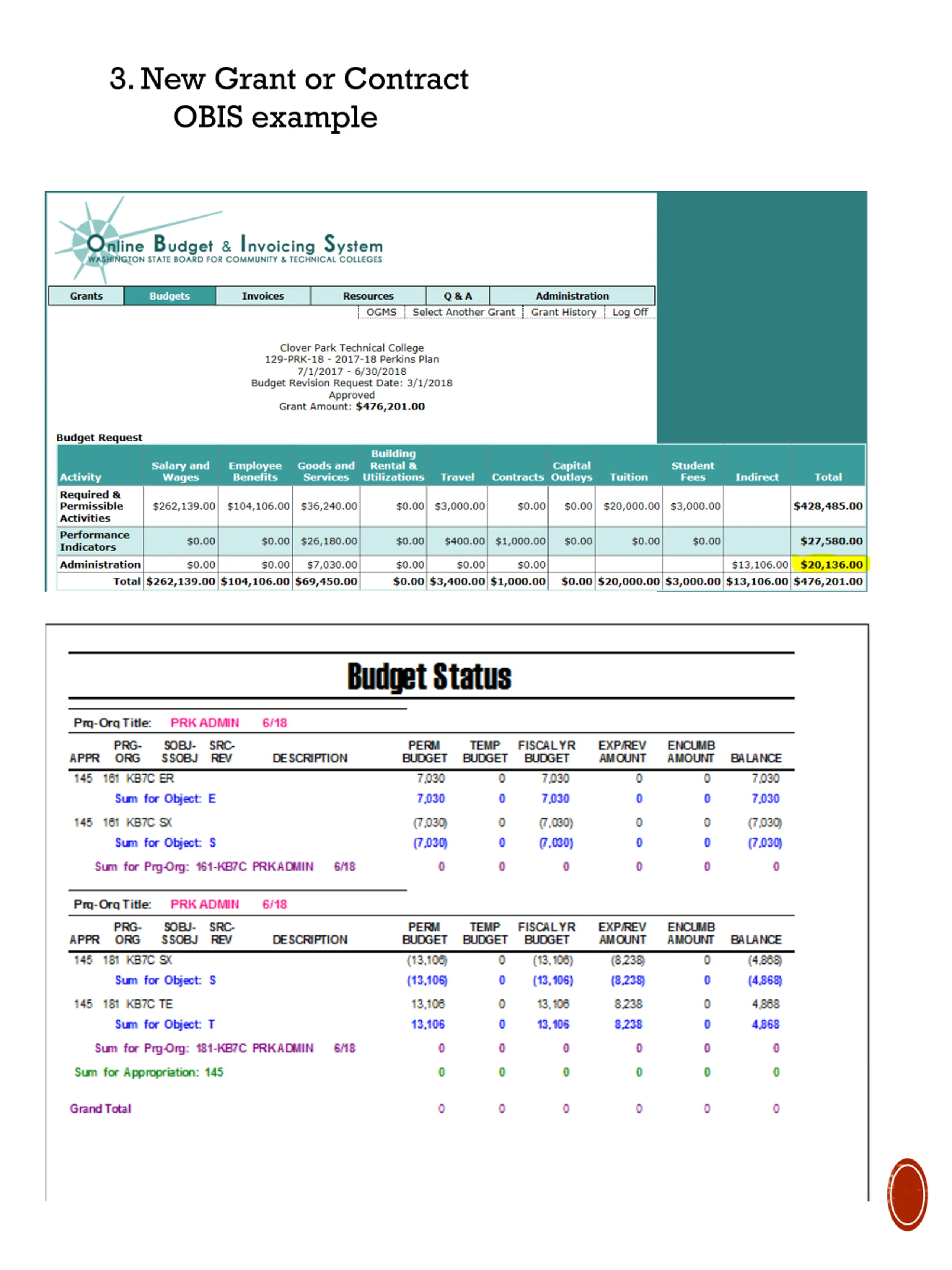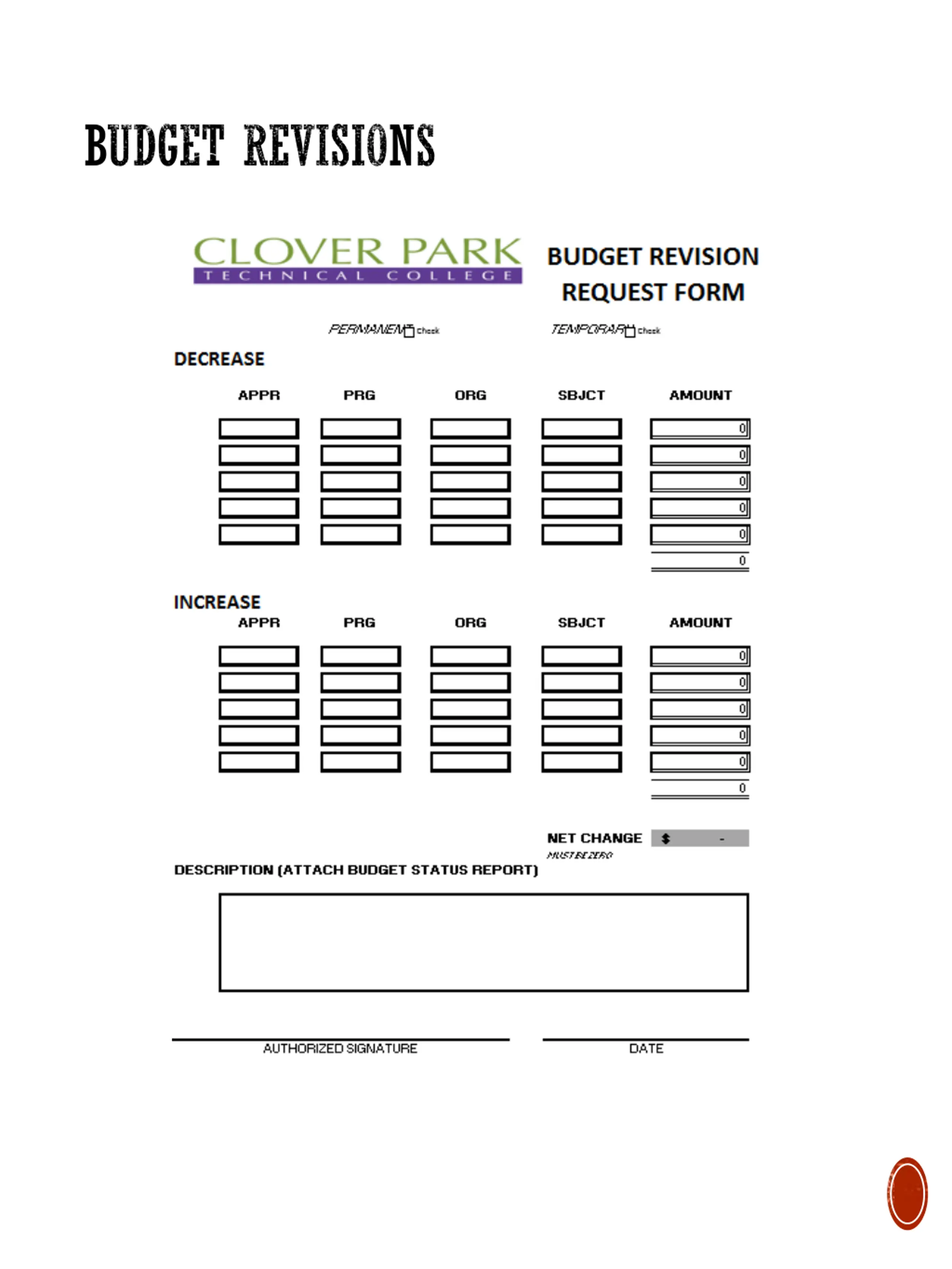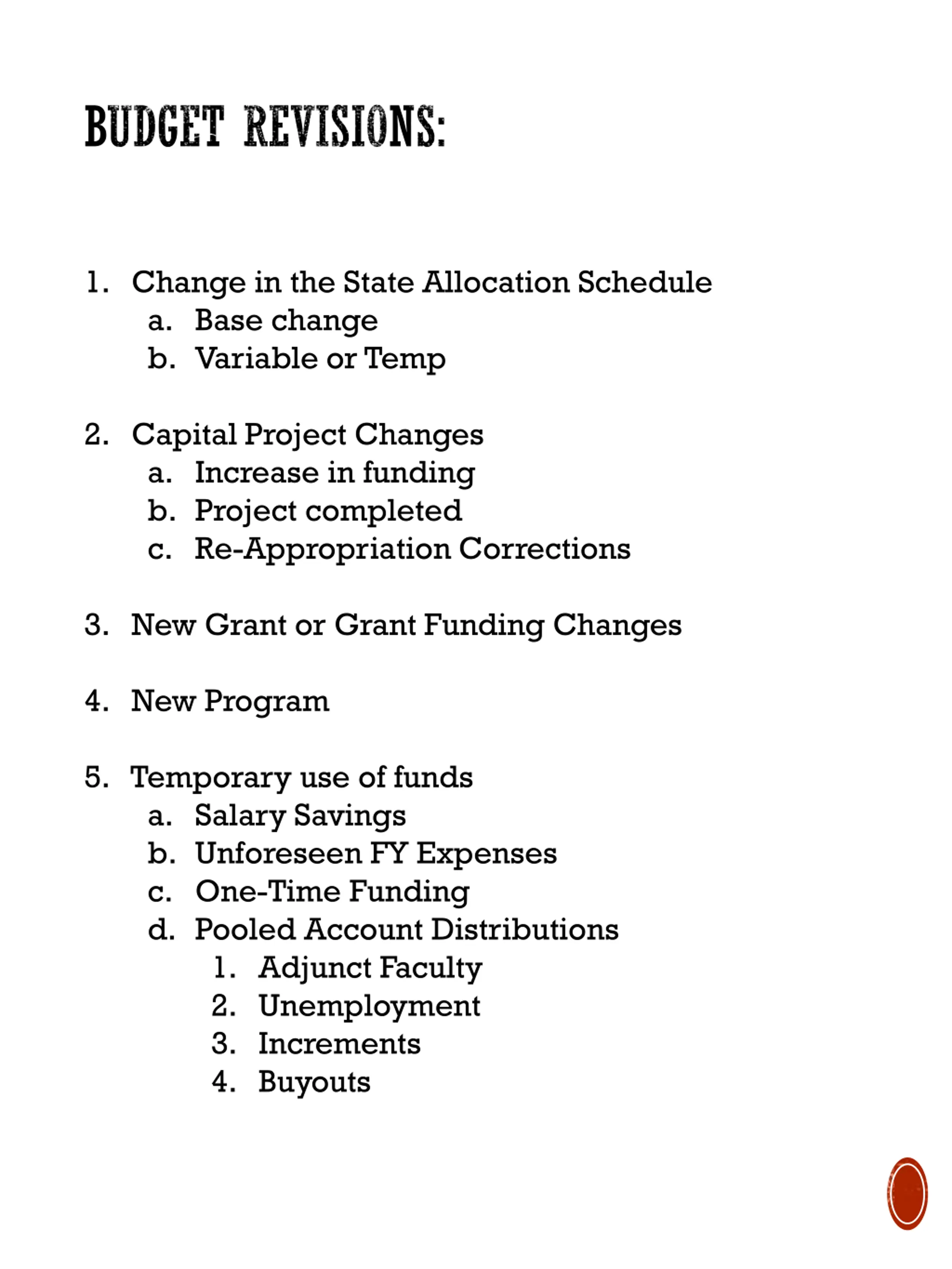 BUDGET REVISIONS: 1. Change in the State Allocation Schedule a. Base change b. Variable or Temp 2. Capital Project Changes a. Increase in funding b. Project completed c. Re-Appropriation Corrections 3. New Grant or Grant Funding Changes 4. New Program 5. Temporary use of funds a. Salary Savings b. Unforeseen FY Expenses c. One-Time Funding d. Pooled Account Distributions 1. Adjunct Faculty 2. Unemployment 3. Increments 4. Buyouts
