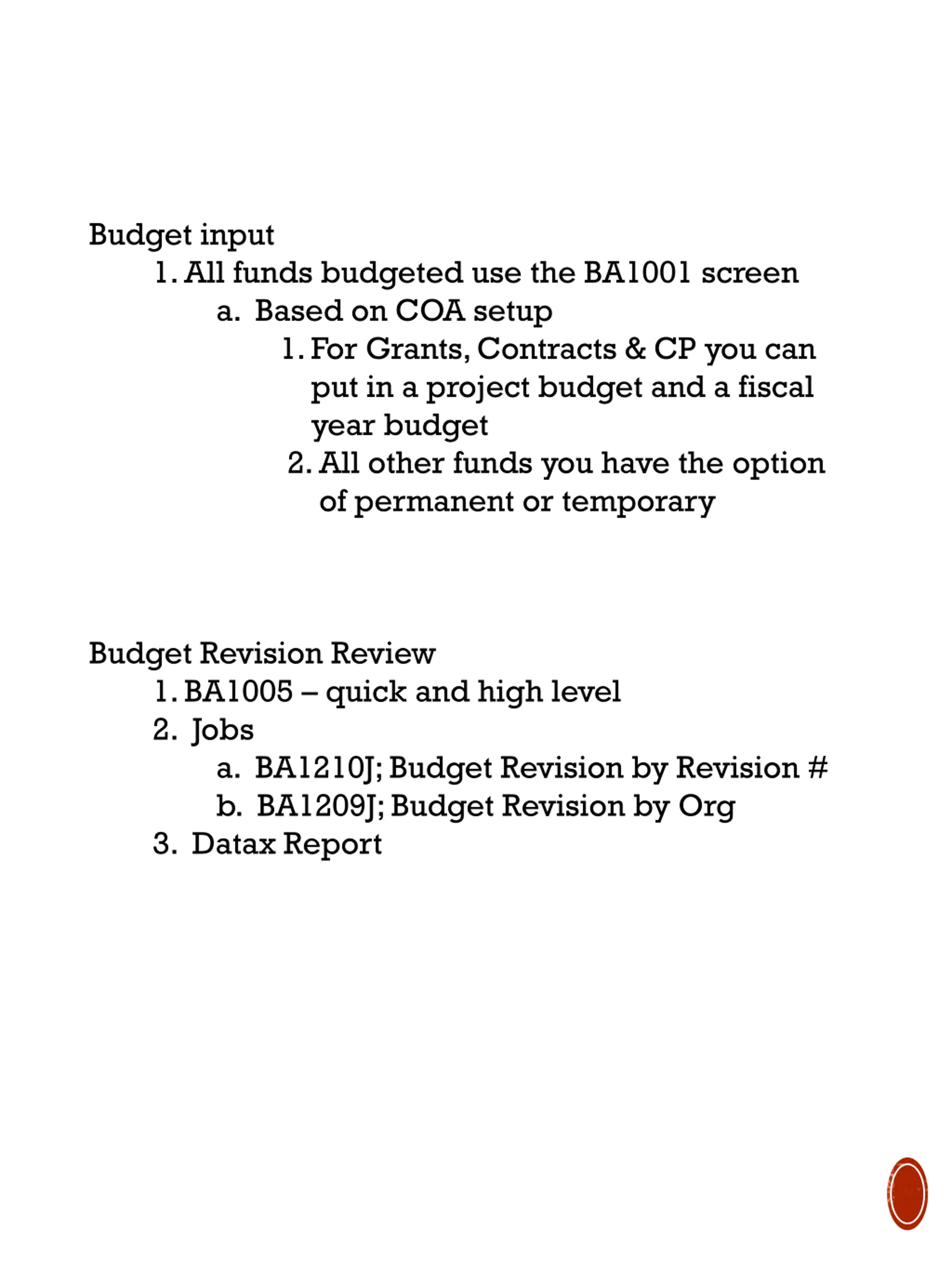 Budget input 1. All funds budgeted use the BA1001 screen a. Based on COA setup 1. For Grants, Contracts & CP you can put in a project budget and a fiscal year budget 2. All other funds you have the option of permanent or temporary Budget Revision Review 1. BA1005 quick and high level 2. Jobs a. BA1210J; Budget Revision by Revision # b. BA1209J; Budget Revision by Org 3. Datax Report