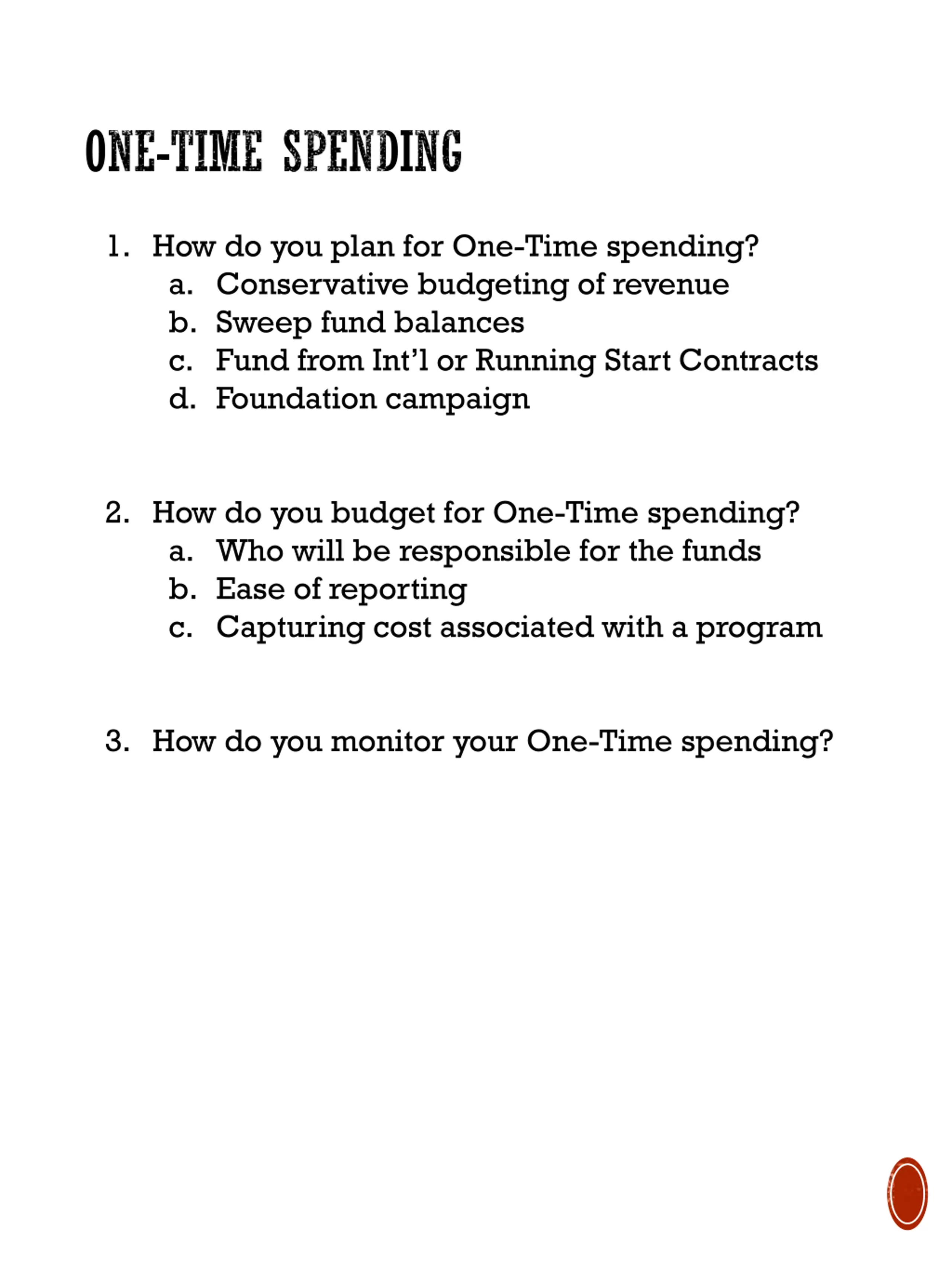 ONE-TIME SPENDING 1. How do you plan for One-Time spending? a. Conservative budgeting of revenue b. Sweep fund balances c. Fund from Int l or Running Start Contracts d. Foundation campaign 2. How do you budget for One-Time spending? a. Who will be responsible for the funds b. Ease of reporting c. Capturing cost associated with a program 3. How do you monitor your One-Time spending?