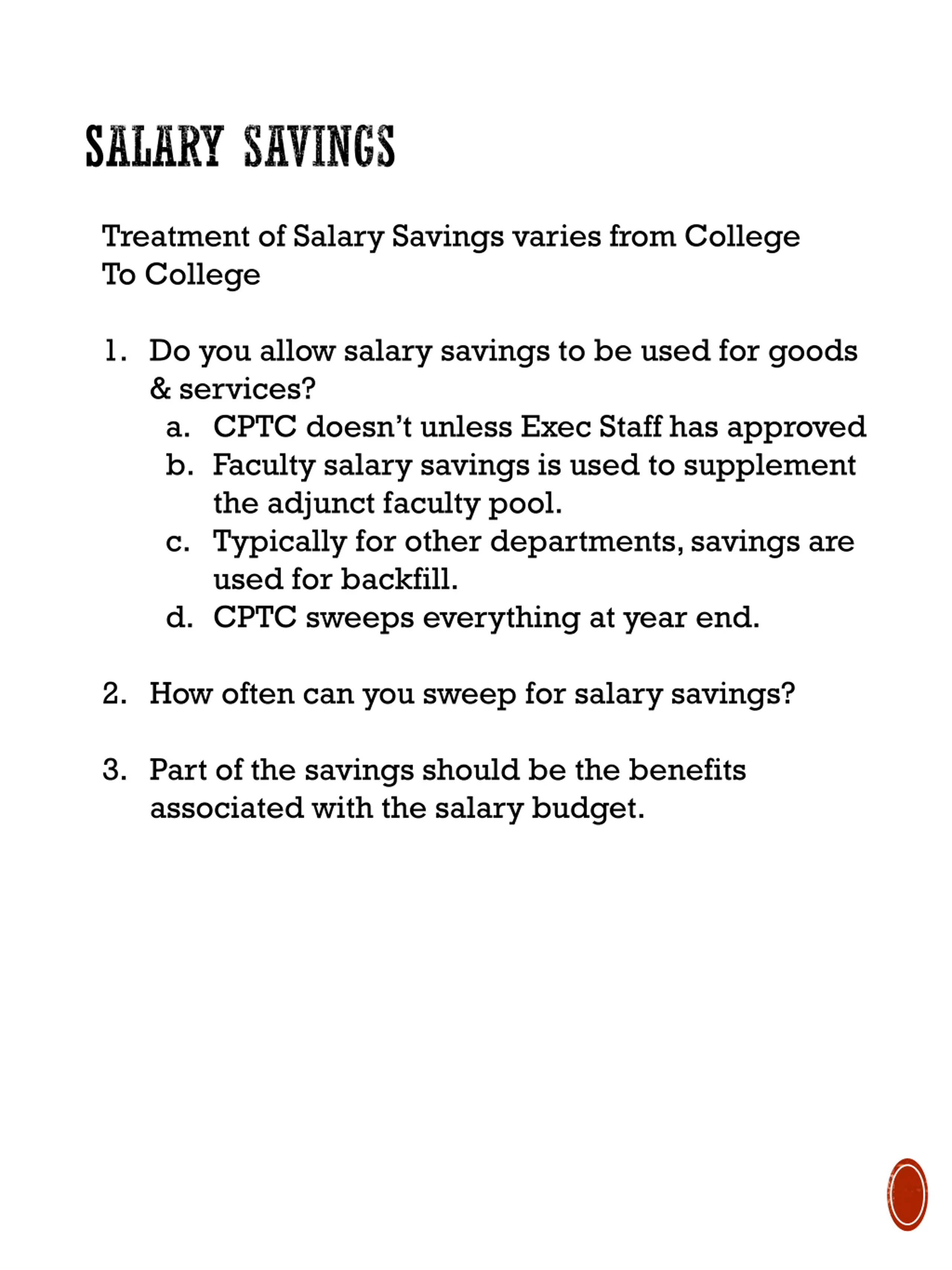 SALARY SAVINGS Treatment of Salary Savings varies from College To College 1. Do you allow salary savings to be used for goods & services? a. CPTC doesn t unless Exec Staff has approved b. Faculty salary savings is used to supplement the adjunct faculty pool. c. Typically for other departments, savings are used for backfill. d. CPTC sweeps everything at year end. 2. How often can you sweep for salary savings? 3. Part of the savings should be the benefits associated with the salary budget.