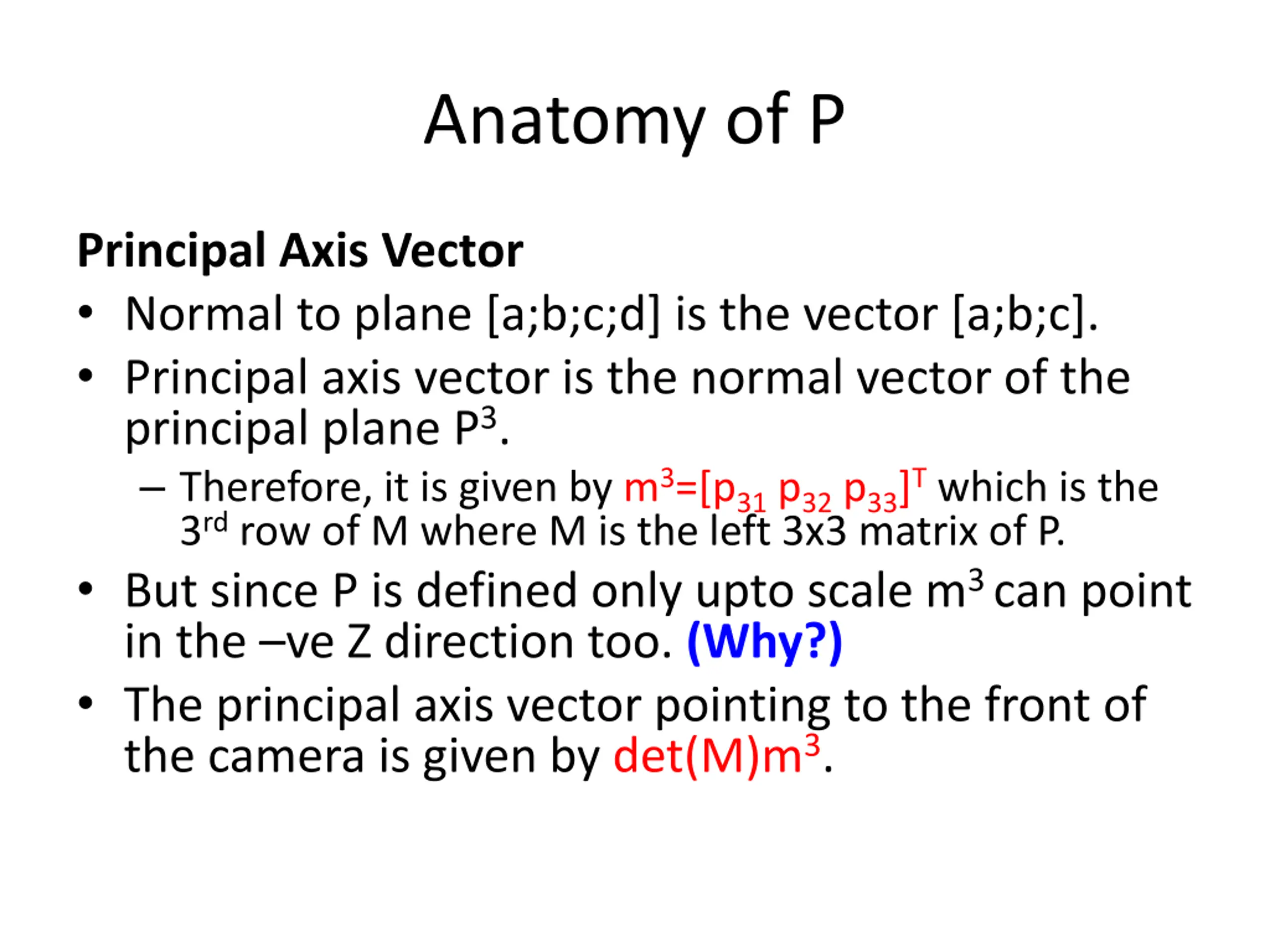 Anatomy of P Principal Axis Vector Normal to plane [a;b;c;d] is the vector [a;b;c]. Principal axis vector is the normal vector of the principal plane P3. Therefore, it is given by m3=[p31 p32 p33]T which is the 3rd row of M where M is the left 3x3 matrix of P. But since P is defined only upto scale m3 can point in the ve Z direction too. (Why?) The principal axis vector pointing to the front of the camera is given by det(M)m3.