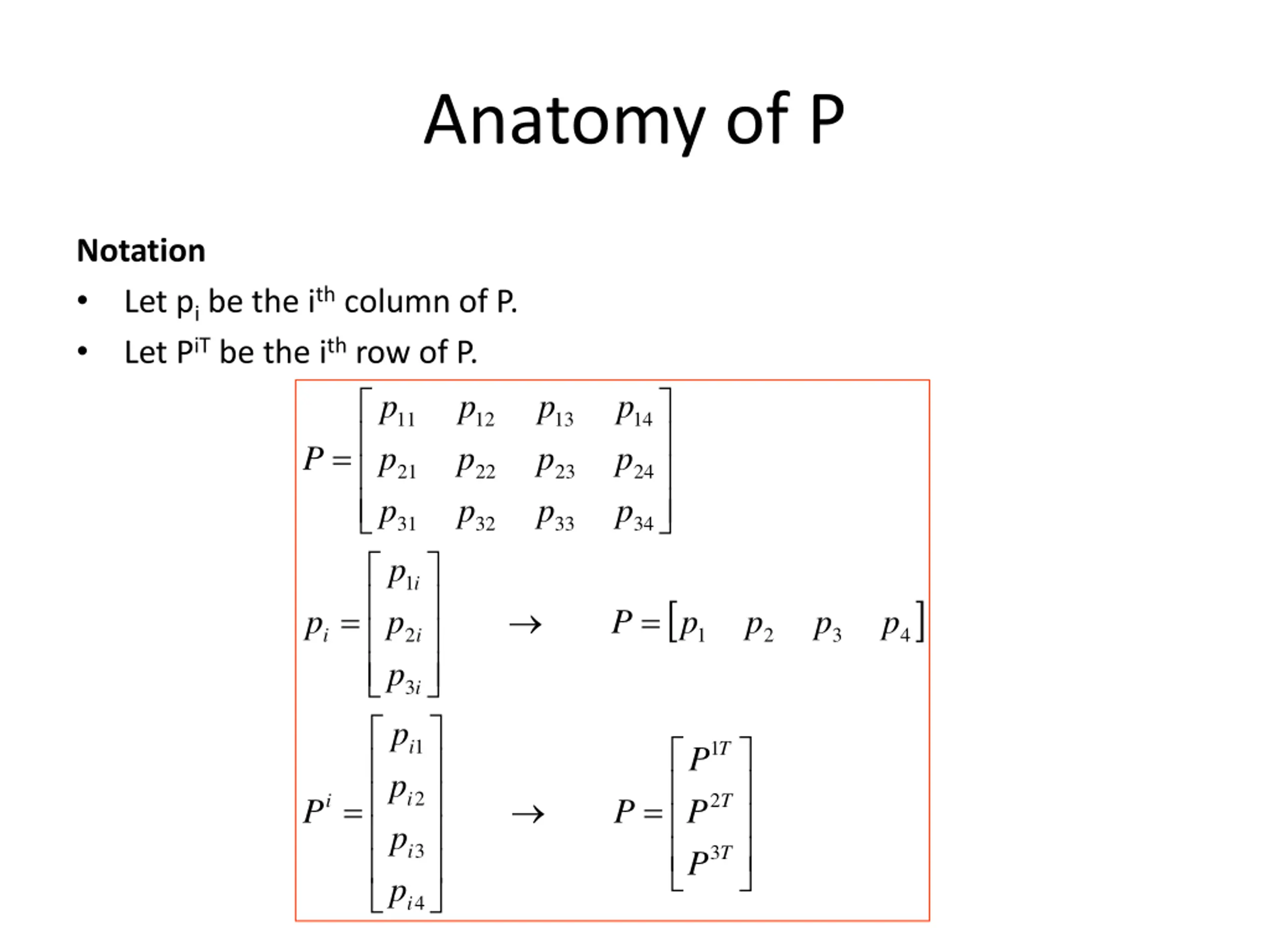 Anatomy of P Notation Let pi be the ith column of P. Let PiT be the ith row of P. p p p p 11 12 13 14 = P p p p p 21 22 23 24 p p p p 31 32 33 34 p 1 i = = p p P p p p p 2 1 2 3 4 i i p 3 i p 1 i 1 T P p 2 i = = 2 i T P P P p 3 i 3 T P p 4 i