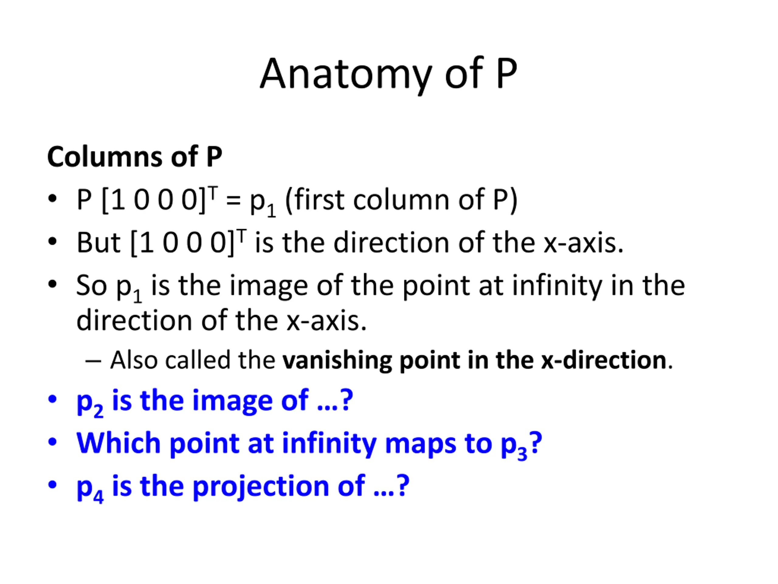 Anatomy of P Columns of P P [1 0 0 0]T = p1 (first column of P) But [1 0 0 0]T is the direction of the x-axis. So p1 is the image of the point at infinity in the direction of the x-axis. Also called the vanishing point in the x-direction. p2is the image of ? Which point at infinity maps to p3? p4is the projection of ?
