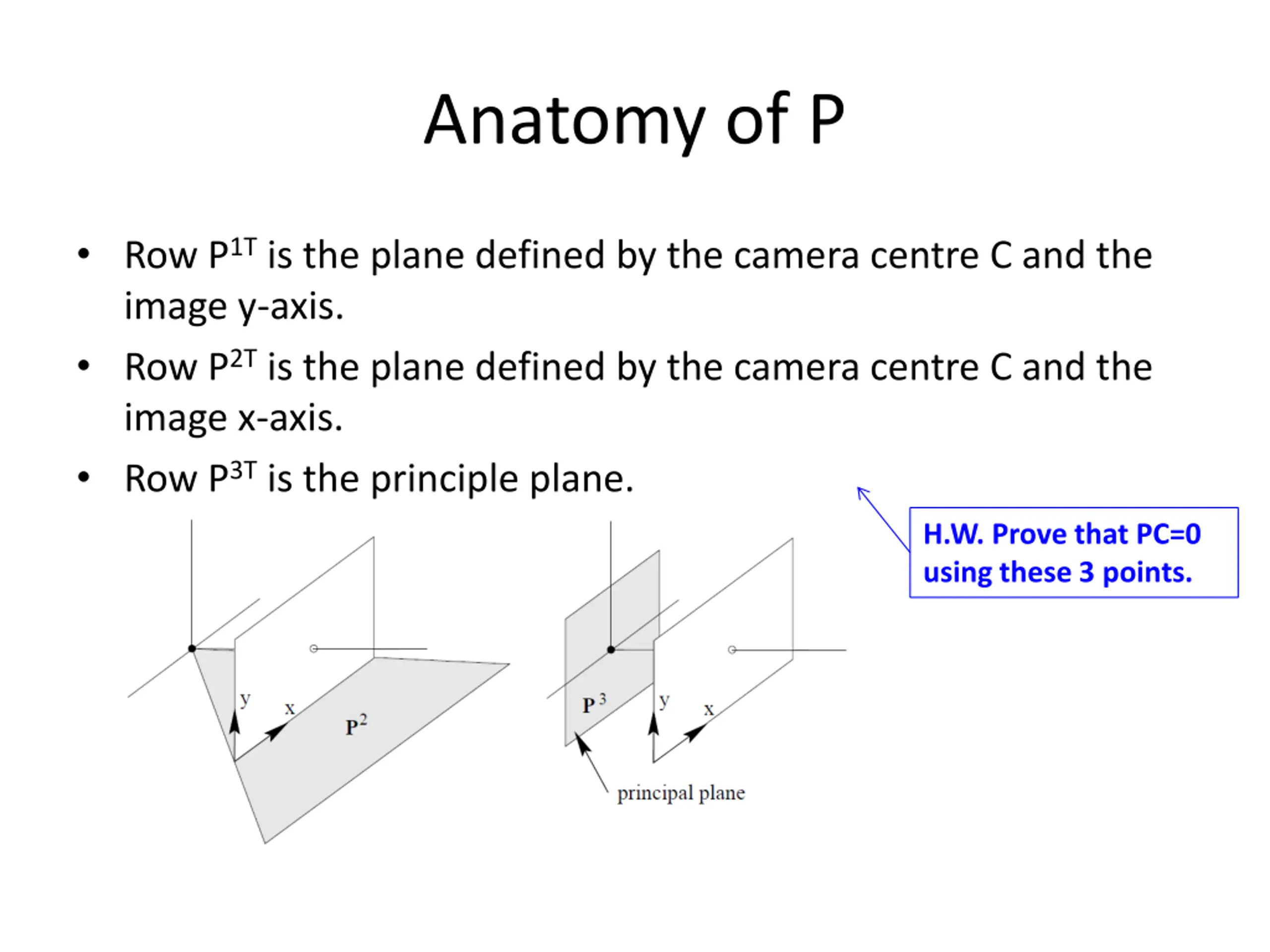 Anatomy of P Row P1T is the plane defined by the camera centre C and the image y-axis. Row P2T is the plane defined by the camera centre C and the image x-axis. Row P3T is the principle plane. H.W. Prove that PC=0 using these 3 points.