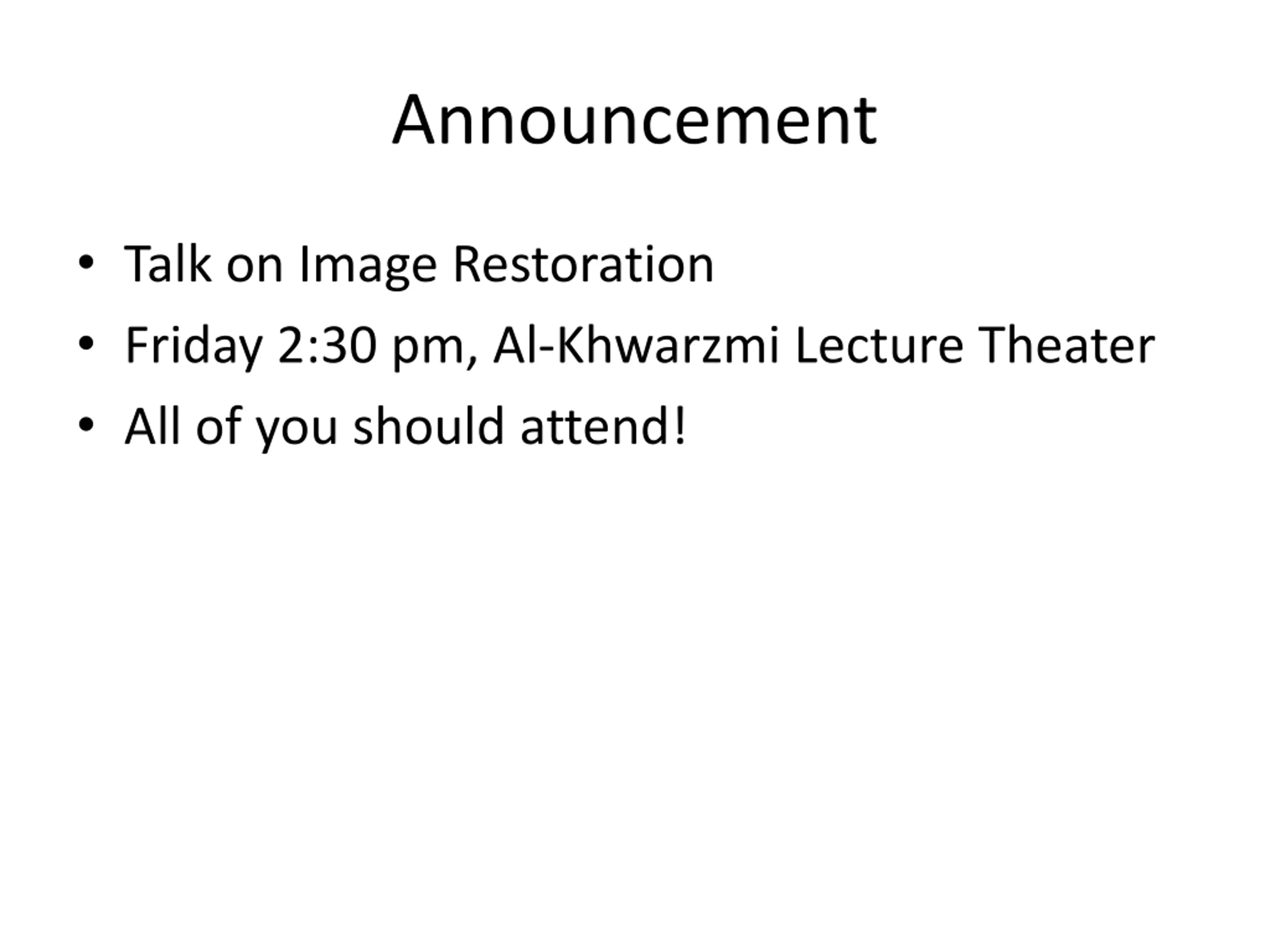 Announcement Talk on Image Restoration Friday 2:30 pm, Al-Khwarzmi Lecture Theater All of you should attend!