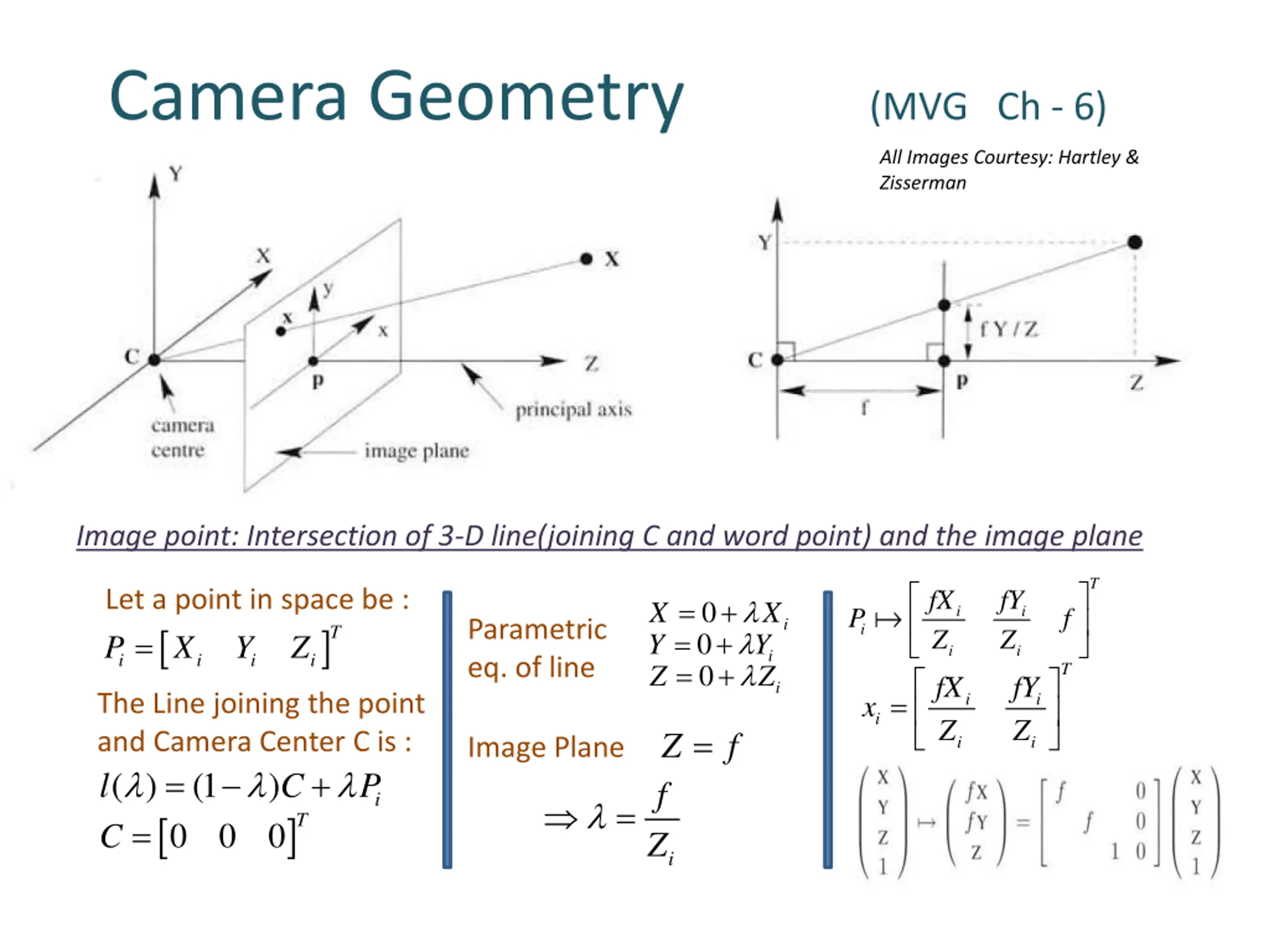 Camera Geometry (MVG Ch - 6) All Images Courtesy: Hartley & Zisserman Image point: Intersection of 3-D line(joining C and word point) and the image plane T fX Z fX Z fY Z Let a point in space be : i i i P X Y = = + = + = + 0 0 0 X Y Z X Y Z i i P f i Parametric eq. of line i T Z i i i i T fY Z i = i i x The Line joining the point and Camera Center C is : ( ) (1 l = 0 0 C = i = Z f Z f i i Image Plane + ) 0 C P i = T i