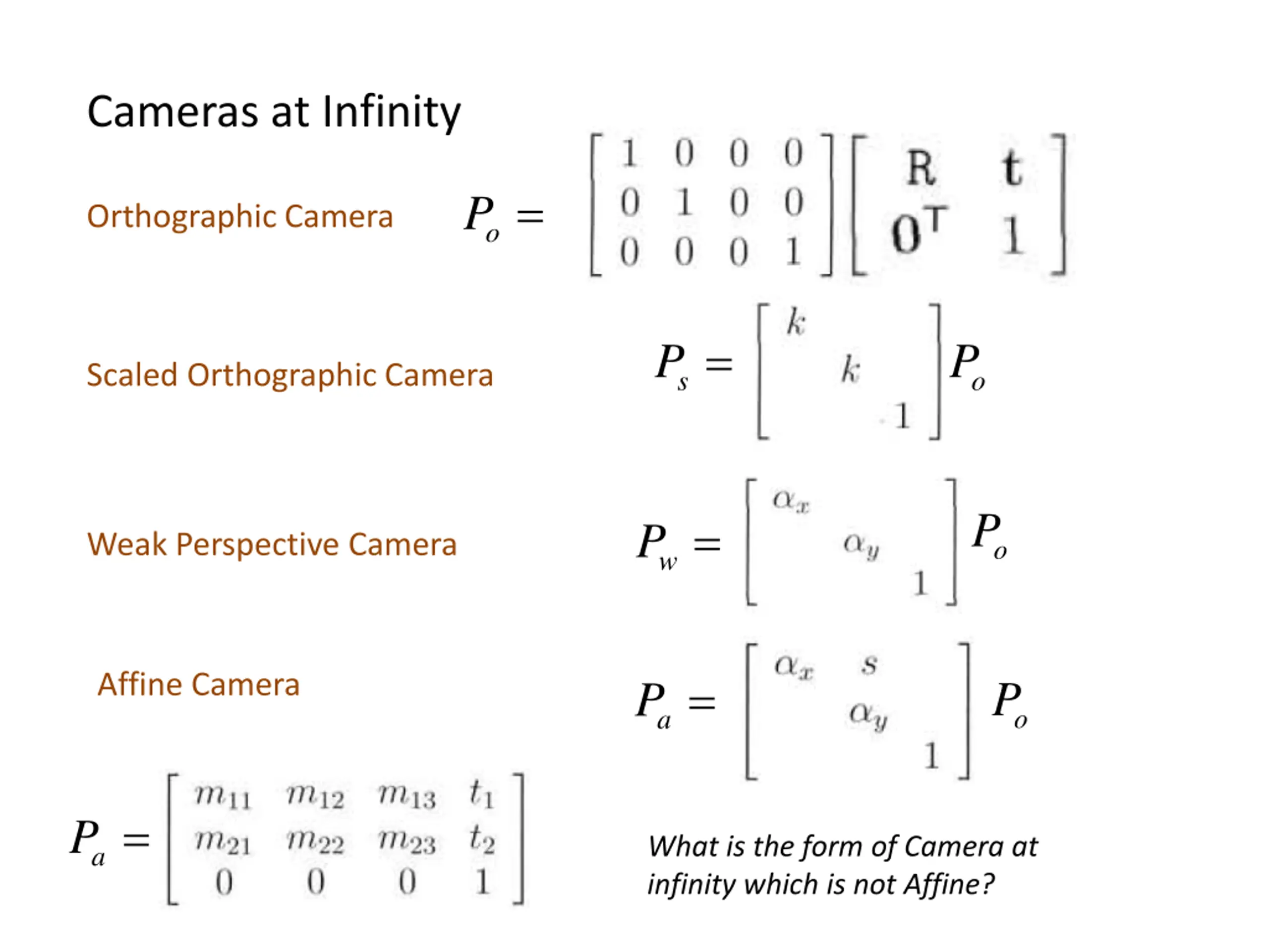 Cameras at Infinity oP = Orthographic Camera sP = oP Scaled Orthographic Camera oP w P = Weak Perspective Camera aP = Affine Camera oP aP = What is the form of Camera at infinity which is not Affine?