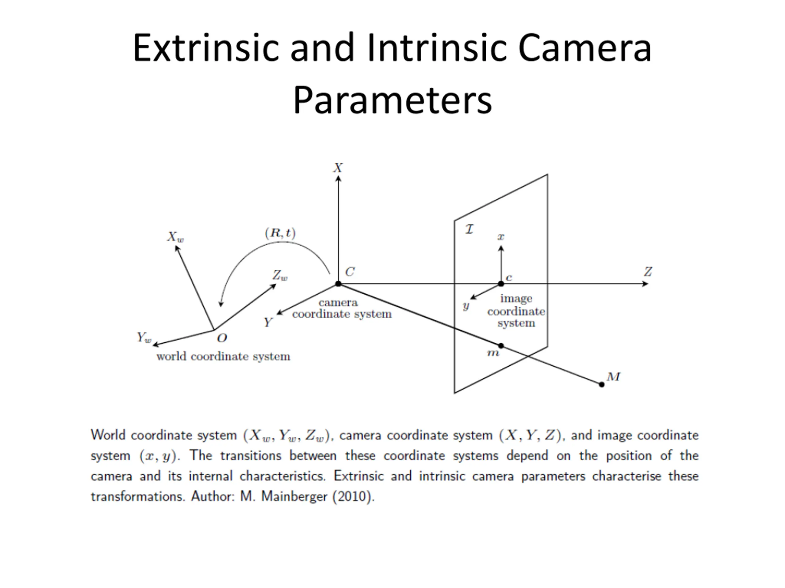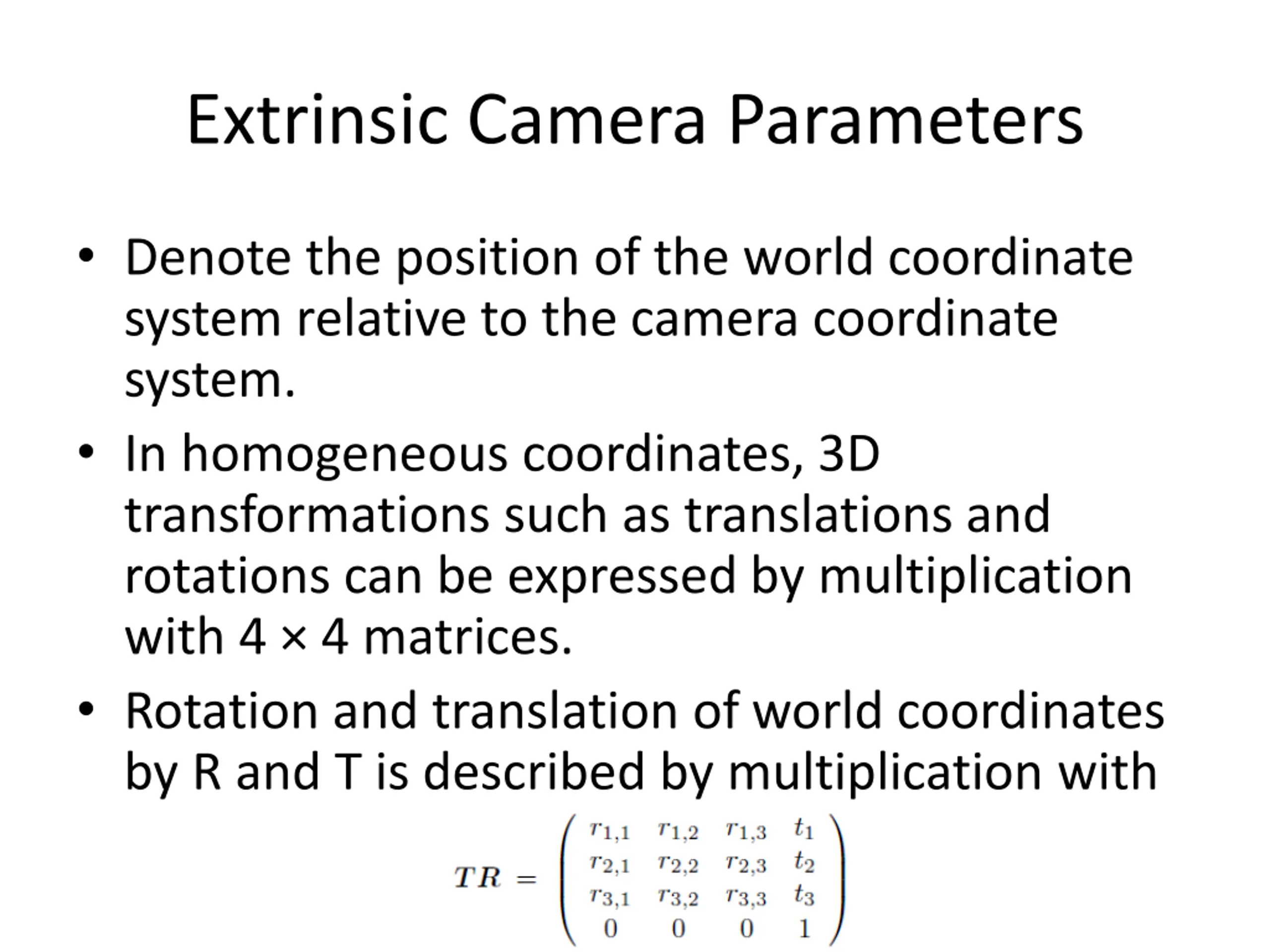 Extrinsic Camera Parameters Denote the position of the world coordinate system relative to the camera coordinate system. In homogeneous coordinates, 3D transformations such as translations and rotations can be expressed by multiplication with 4 4 matrices. Rotation and translation of world coordinates by R and T is described by multiplication with