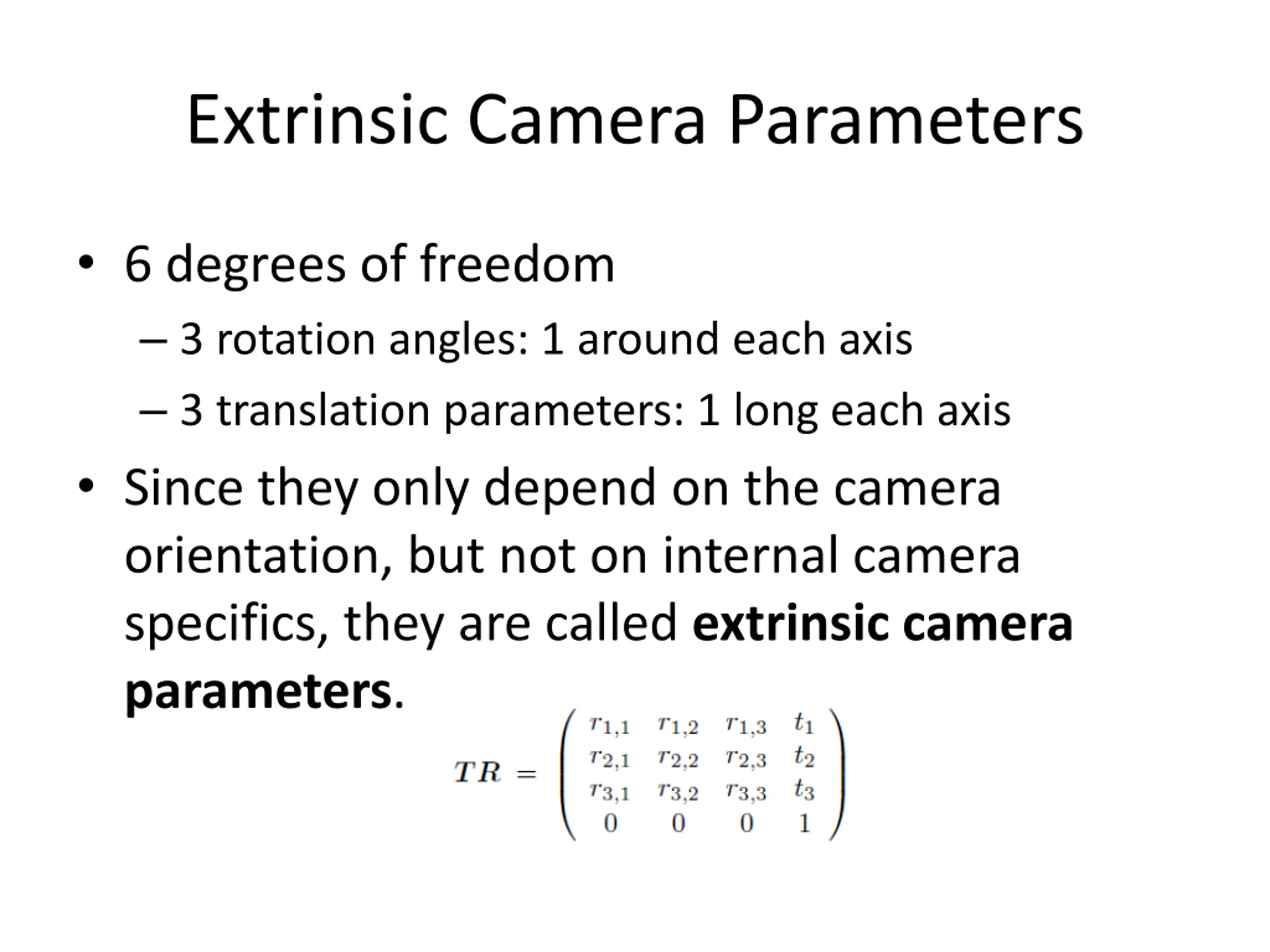 Extrinsic Camera Parameters 6 degrees of freedom 3 rotation angles: 1 around each axis 3 translation parameters: 1 long each axis Since they only depend on the camera orientation, but not on internal camera specifics, they are called extrinsic camera parameters.