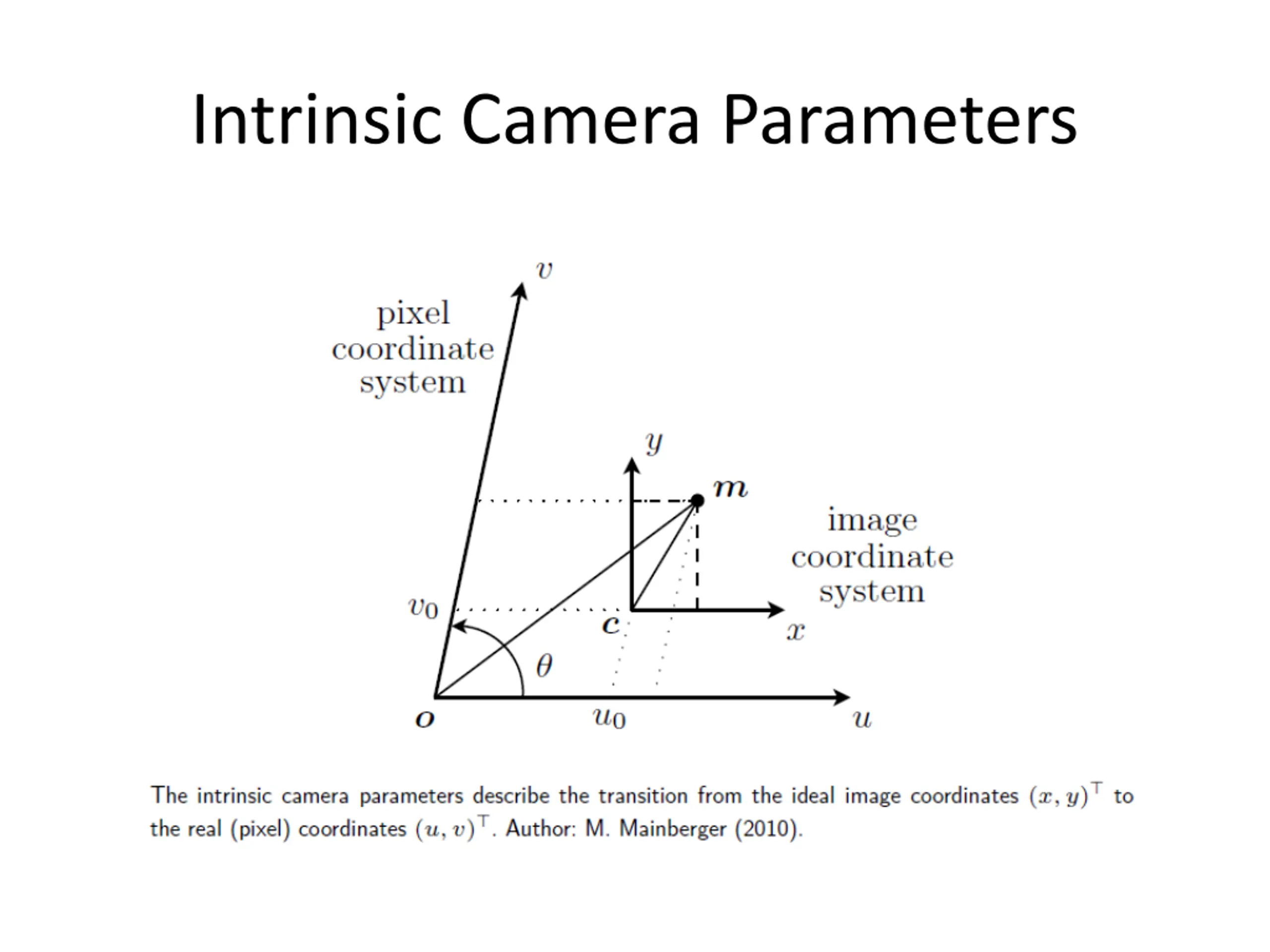 Intrinsic Camera Parameters Characterise the geometry of the image plane inside the camera Problems: Origin of the image plane can be located in another point than the principal point, e.g. at the top left. Let the principal point in this coordinate system be located in (u0, v0)T. Pixels may have different dimensions hu and hv. In the worst case, the coordinate axis may have an angle 90 degrees. These 5 intrinsic parameters lead to a matrix that describes the transition from the ideal image coordinates to the real (pixel) coordinates.