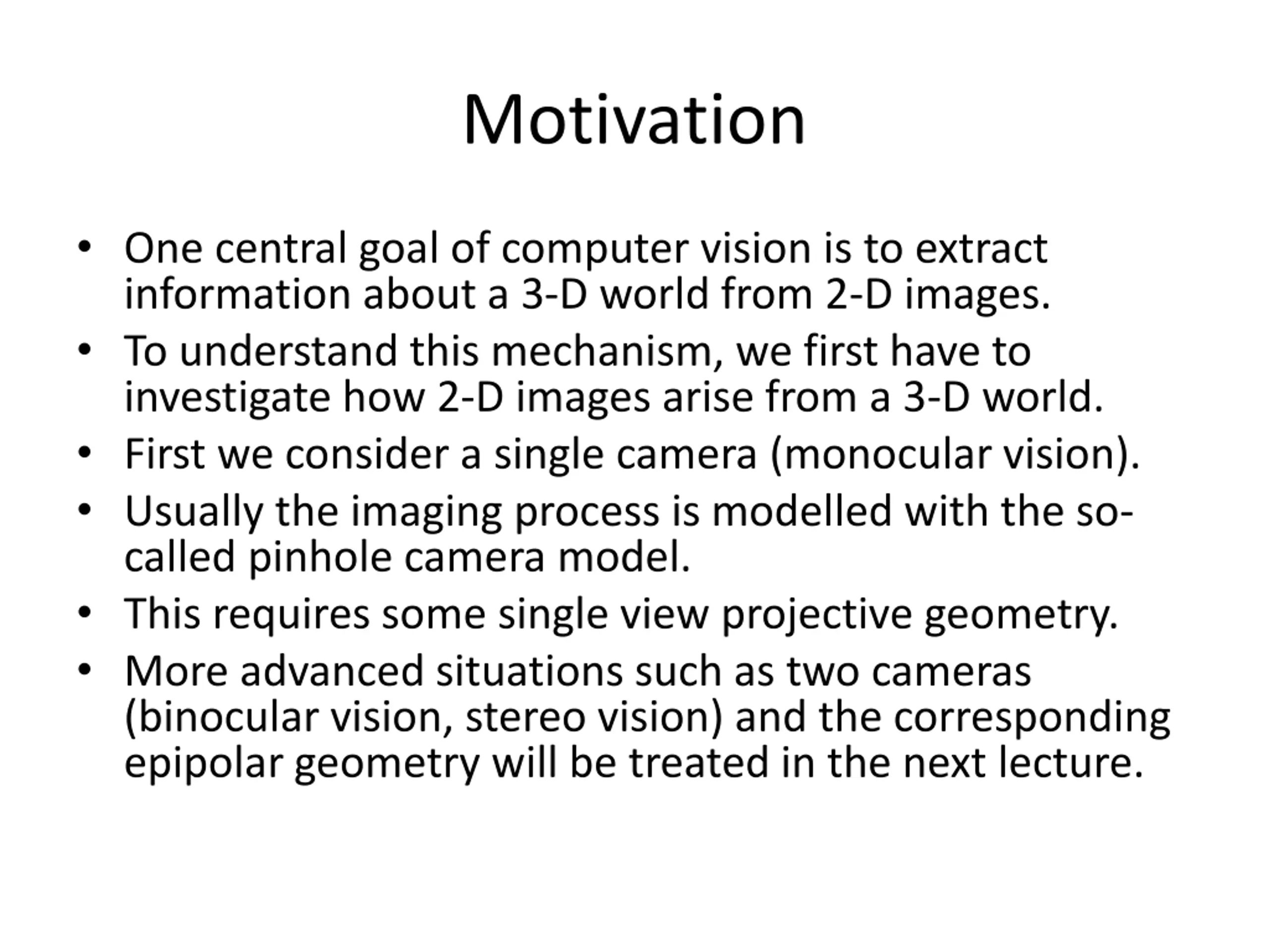 Motivation One central goal of computer vision is to extract information about a 3-D world from 2-D images. To understand this mechanism, we first have to investigate how 2-D images arise from a 3-D world. First we consider a single camera (monocular vision). Usually the imaging process is modelled with the so- called pinhole camera model. This requires some single view projective geometry. More advanced situations such as two cameras (binocular vision, stereo vision) and the corresponding epipolar geometry will be treated in the next lecture.