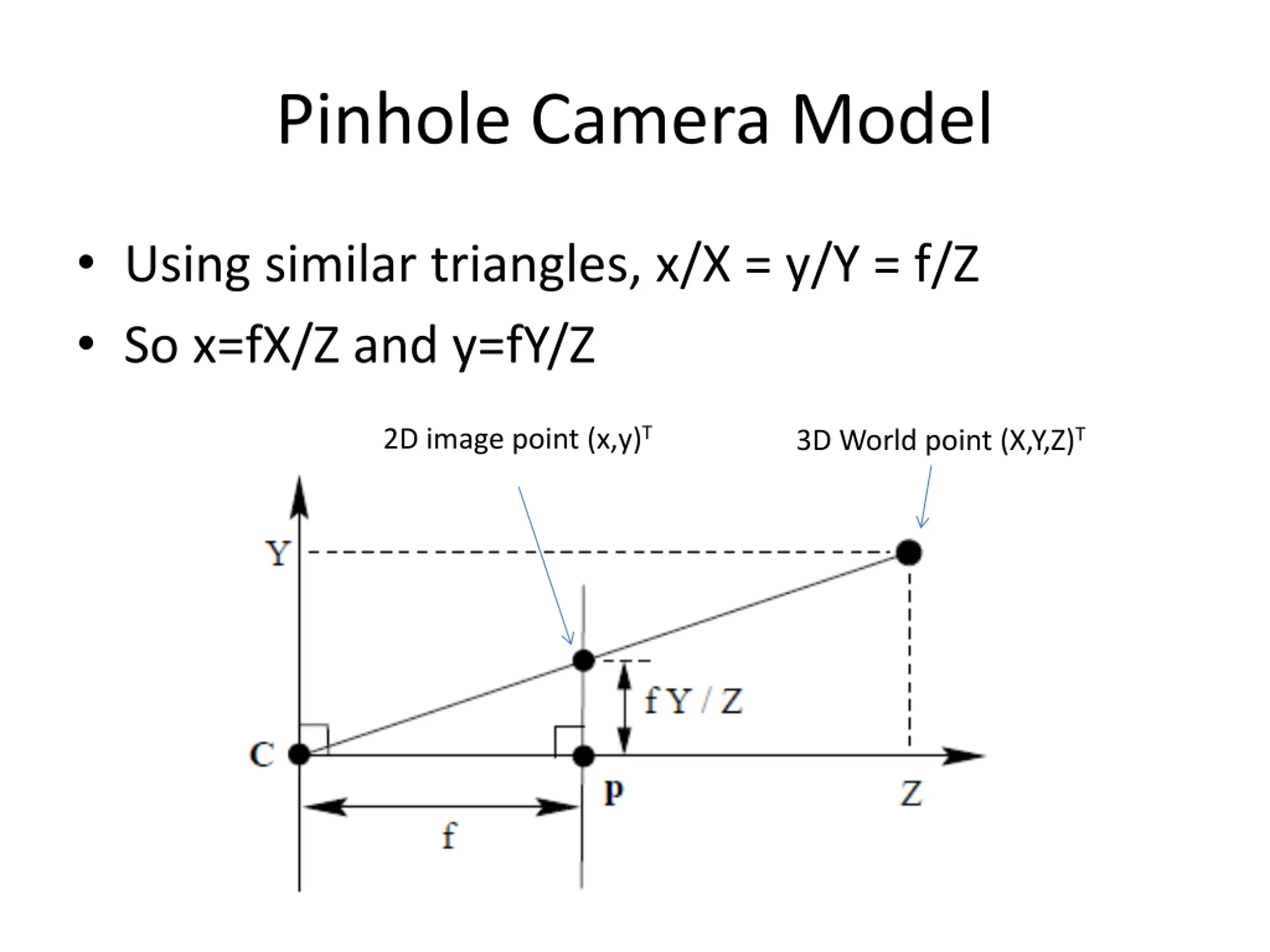 Pinhole Camera Model Using similar triangles, x/X = y/Y = f/Z So x=fX/Z and y=fY/Z 2D image point (x,y)T 3D World point (X,Y,Z)T