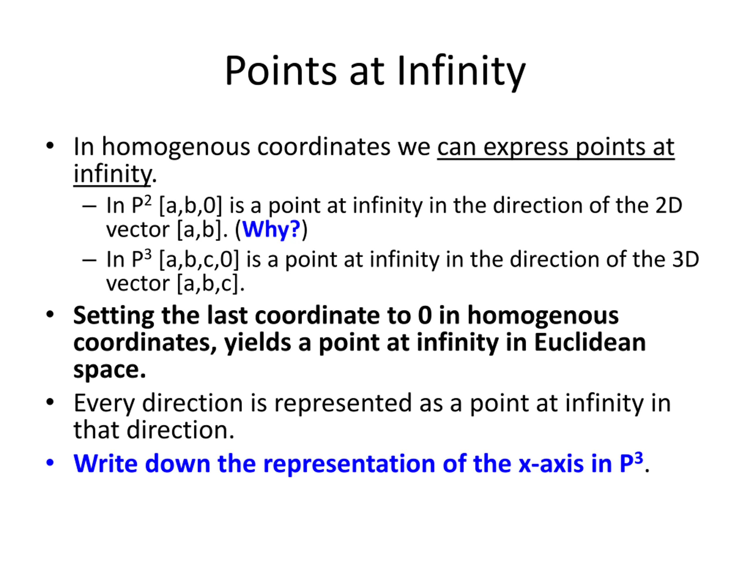 Points at Infinity In homogenous coordinates we can express points at infinity. In P2 [a,b,0] is a point at infinity in the direction of the 2D vector [a,b]. (Why?) In P3 [a,b,c,0] is a point at infinity in the direction of the 3D vector [a,b,c]. Setting the last coordinate to 0 in homogenous coordinates, yields a point at infinity in Euclidean space. Every direction is represented as a point at infinity in that direction. Write down the representation of the x-axis in P3.