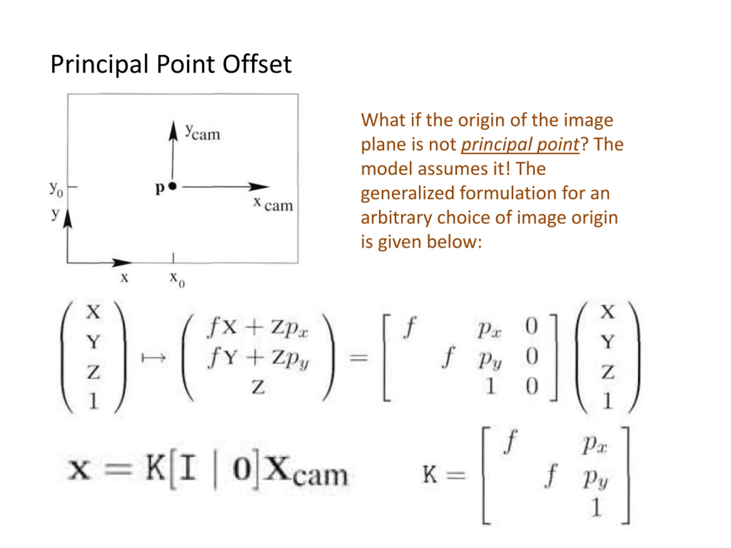 Principal Point Offset What if the origin of the image plane is not principal point? The model assumes it! The generalized formulation for an arbitrary choice of image origin is given below: