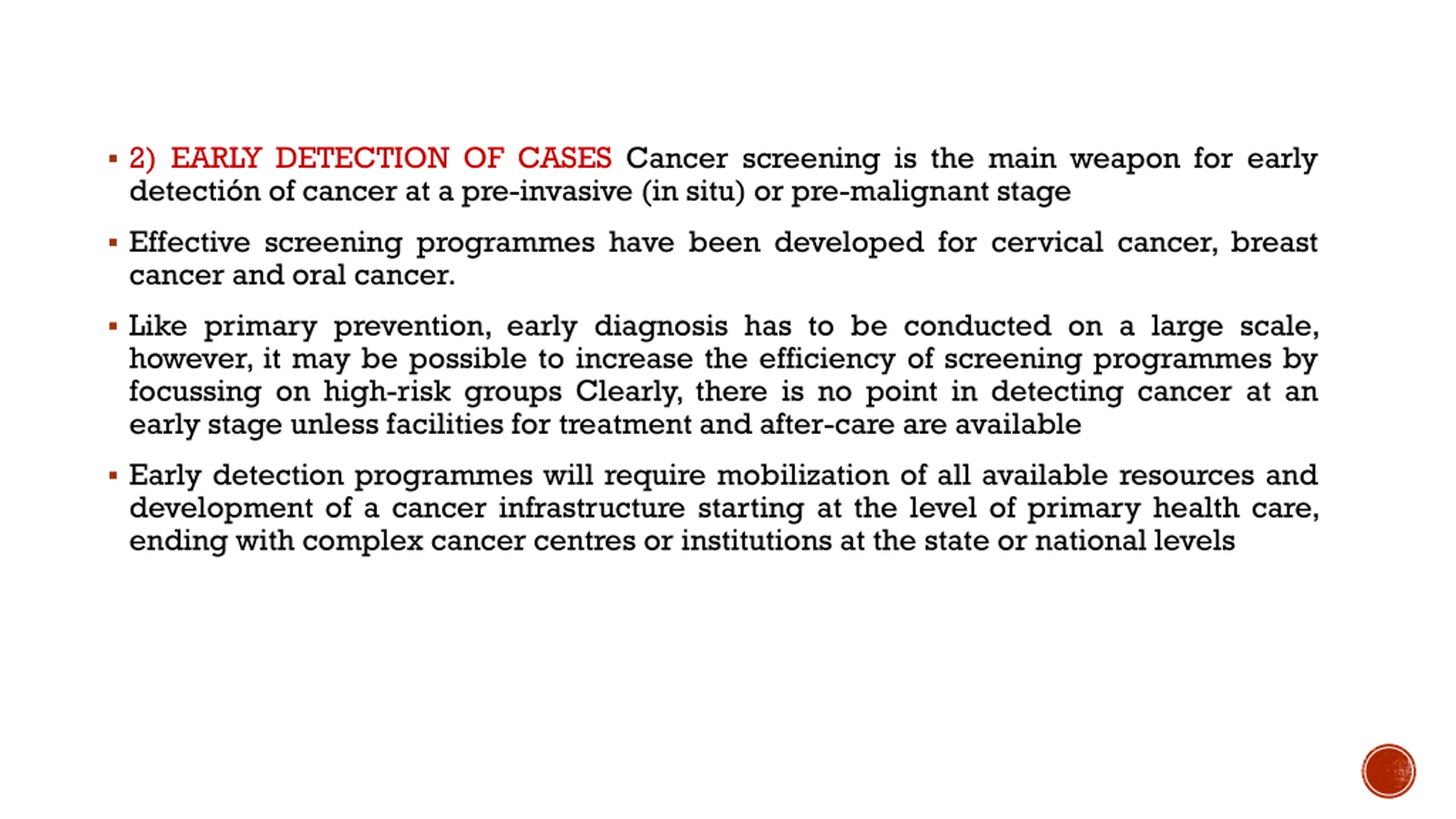 2) EARLY DETECTION OF CASES Cancer screening is the main weapon for early detecti n of cancer at a pre-invasive (in situ) or pre-malignant stage Effective screening programmes have been developed for cervical cancer, breast cancer and oral cancer. Like primary prevention, early diagnosis has to be conducted on a large scale, however, it may be possible to increase the efficiency of screening programmes by focussing on high-risk groups Clearly, there is no point in detecting cancer at an early stage unless facilities for treatment and after-care are available Early detection programmes will require mobilization of all available resources and development of a cancer infrastructure starting at the level of primary health care, ending with complex cancer centres or institutions at the state or national levels