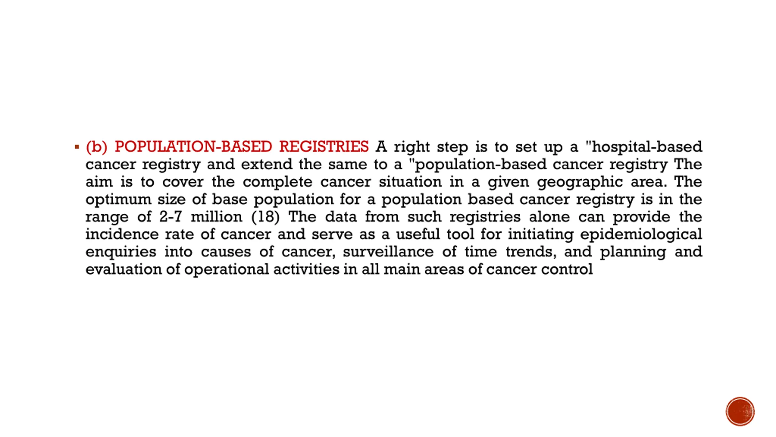 (b) POPULATION-BASED REGISTRIES A right step is to set up a "hospital-based cancer registry and extend the same to a "population-based cancer registry The aim is to cover the complete cancer situation in a given geographic area. The optimum size of base population for a population based cancer registry is in the range of 2-7 million (18) The data from such registries alone can provide the incidence rate of cancer and serve as a useful tool for initiating epidemiological enquiries into causes of cancer, surveillance of time trends, and planning and evaluation of operational activities in all main areas of cancer control