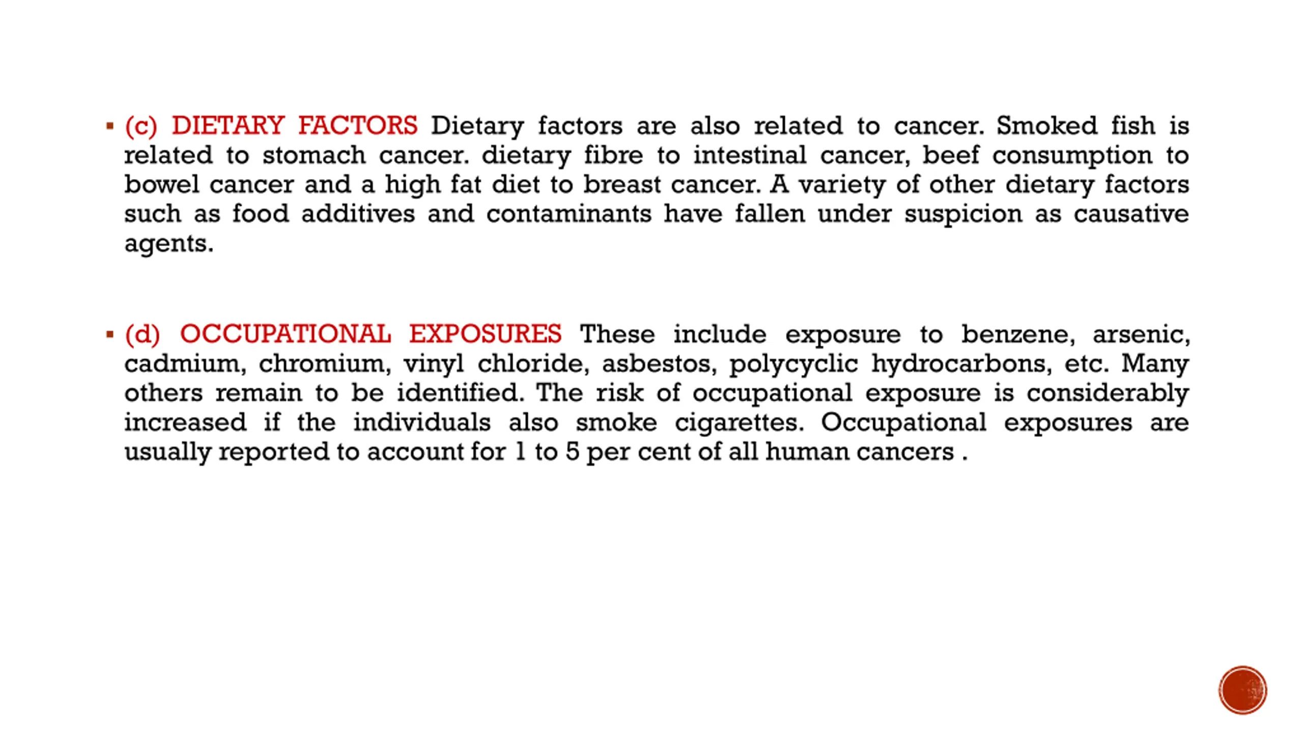 (c) DIETARY FACTORS Dietary factors are also related to cancer. Smoked fish is related to stomach cancer. dietary fibre to intestinal cancer, beef consumption to bowel cancer and a high fat diet to breast cancer. A variety of other dietary factors such as food additives and contaminants have fallen under suspicion as causative agents. (d) OCCUPATIONAL EXPOSURES These include exposure to benzene, arsenic, cadmium, chromium, vinyl chloride, asbestos, polycyclic hydrocarbons, etc. Many others remain to be identified. The risk of occupational exposure is considerably increased if the individuals also smoke cigarettes. Occupational exposures are usually reported to account for 1 to 5 per cent of all human cancers .