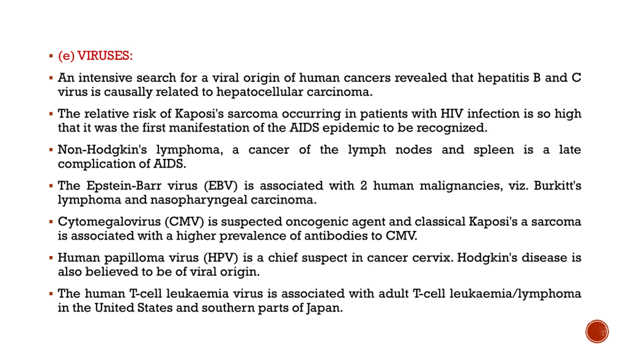 (e)VIRUSES: An intensive search for a viral origin of human cancers revealed that hepatitis B and C virus is causally related to hepatocellular carcinoma. The relative risk of Kaposi's sarcoma occurring in patients with HIV infection is so high that it was the first manifestation of the AIDS epidemic to be recognized. Non-Hodgkin's lymphoma, a cancer of the lymph nodes and spleen is a late complication of AIDS. The Epstein-Barr virus (EBV) is associated with 2 human malignancies, viz. Burkitt's lymphoma and nasopharyngeal carcinoma. Cytomegalovirus (CMV) is suspected oncogenic agent and classical Kaposi's a sarcoma is associated with a higher prevalence of antibodies to CMV. Human papilloma virus (HPV) is a chief suspect in cancer cervix. Hodgkin's disease is also believed to be of viral origin. The human T-cell leukaemia virus is associated with adult T-cell leukaemia/lymphoma in the United States and southern parts of Japan.