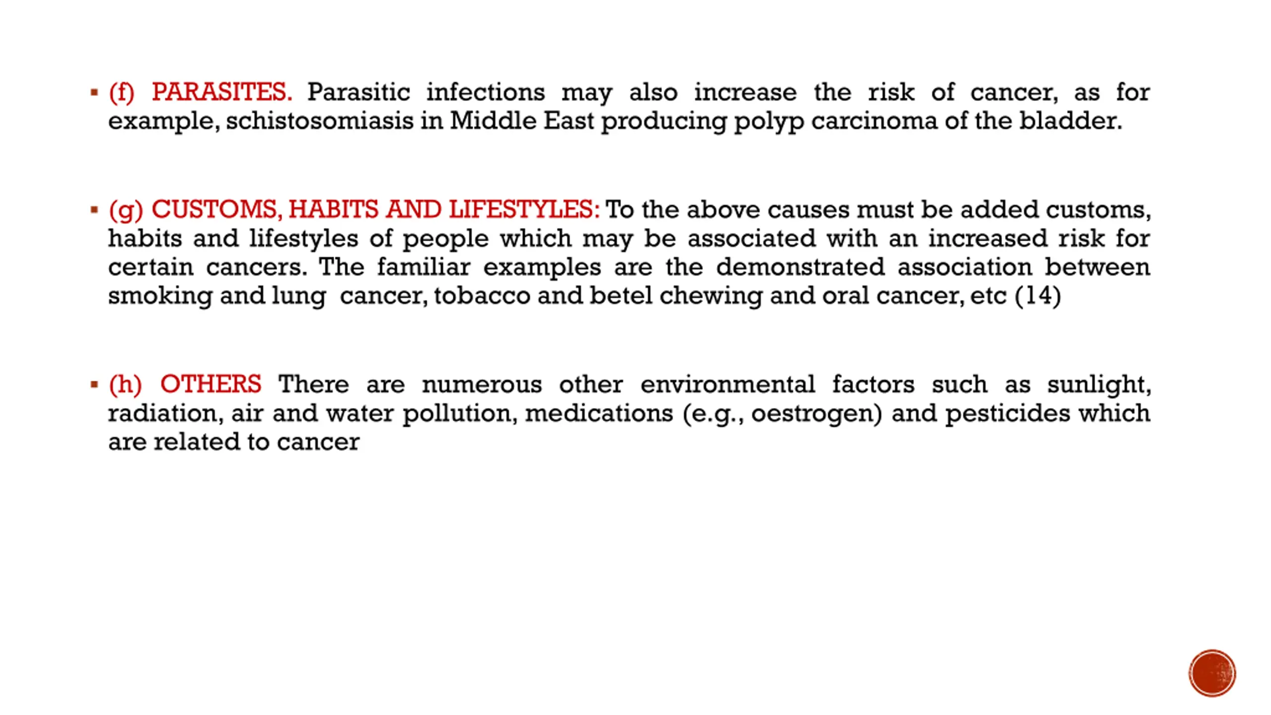 (f) PARASITES. Parasitic infections may also increase the risk of cancer, as for example,schistosomiasis in Middle East producing polyp carcinoma of the bladder. (g) CUSTOMS,HABITS AND LIFESTYLES:To the above causes must be added customs, habits and lifestyles of people which may be associated with an increased risk for certain cancers. The familiar examples are the demonstrated association between smoking and lung cancer,tobacco and betel chewing and oral cancer,etc (14) (h) OTHERS There are numerous other environmental factors such as sunlight, radiation, air and water pollution, medications (e.g., oestrogen) and pesticides which are related to cancer