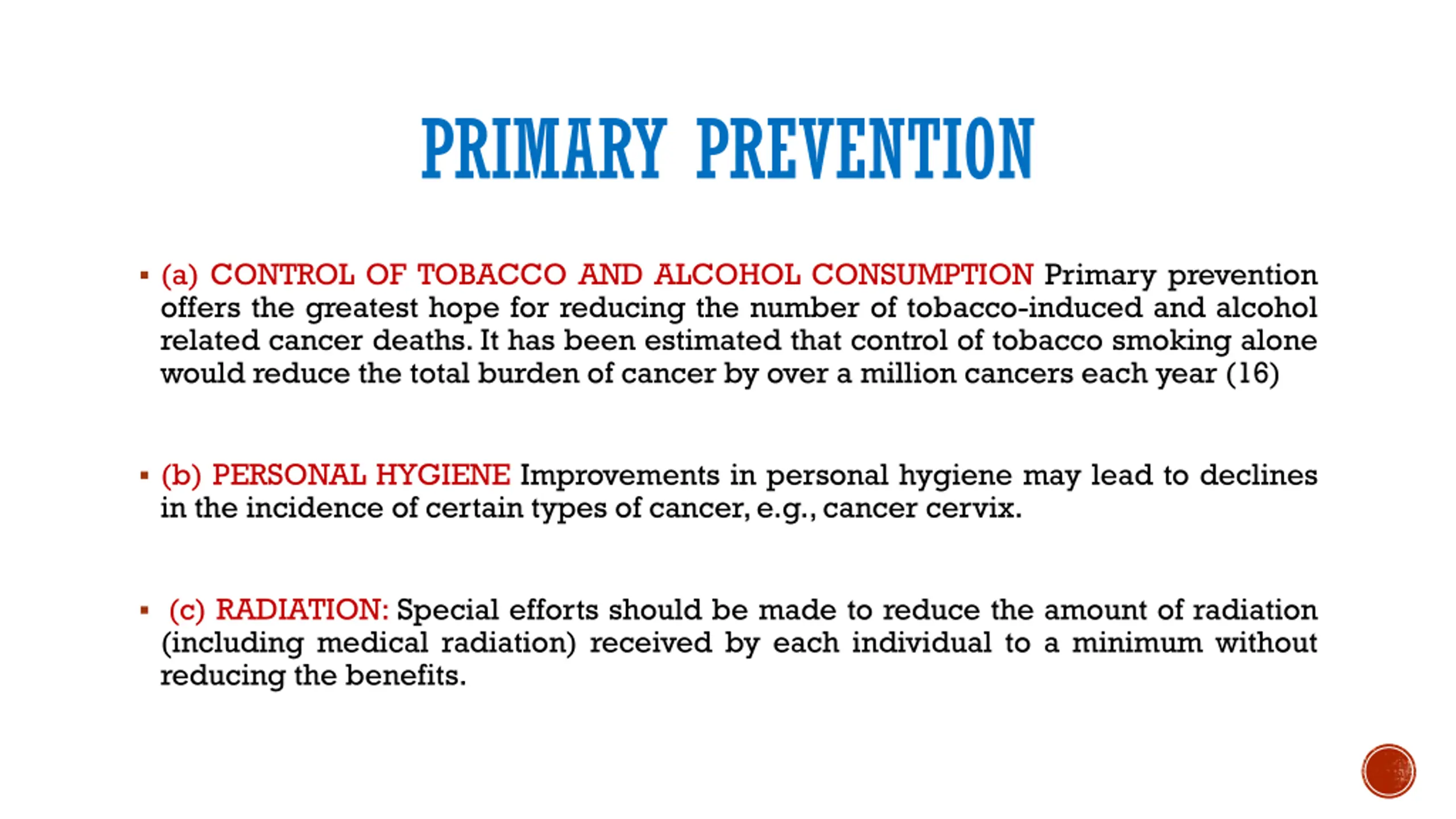 PRIMARY PREVENTION (a) CONTROL OF TOBACCO AND ALCOHOL CONSUMPTION Primary prevention offers the greatest hope for reducing the number of tobacco-induced and alcohol related cancer deaths. It has been estimated that control of tobacco smoking alone would reduce the total burden of cancer by over a million cancers each year (16) (b) PERSONAL HYGIENE Improvements in personal hygiene may lead to declines in the incidence of certain types of cancer,e.g.,cancer cervix. (c) RADIATION: Special efforts should be made to reduce the amount of radiation (including medical radiation) received by each individual to a minimum without reducing the benefits.