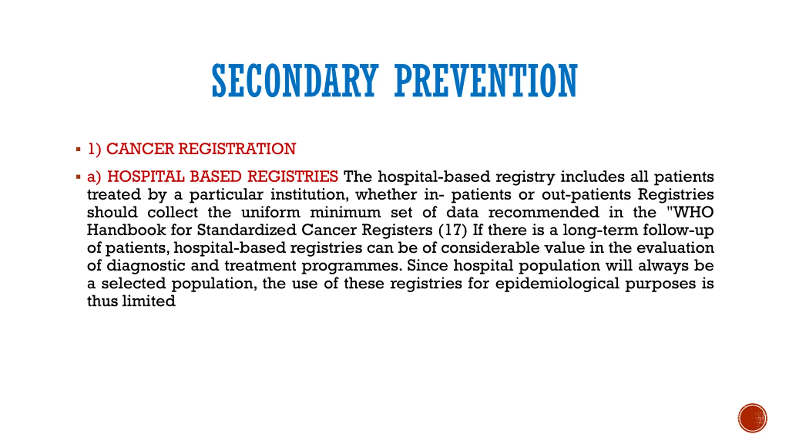 SECONDARY PREVENTION 1) CANCER REGISTRATION a) HOSPITAL BASED REGISTRIES The hospital-based registry includes all patients treated by a particular institution, whether in- patients or out-patients Registries should collect the uniform minimum set of data recommended in the "WHO Handbook for Standardized Cancer Registers (17) If there is a long-term follow-up of patients,hospital-based registries can be of considerable value in the evaluation of diagnostic and treatment programmes. Since hospital population will always be a selected population, the use of these registries for epidemiological purposes is thus limited