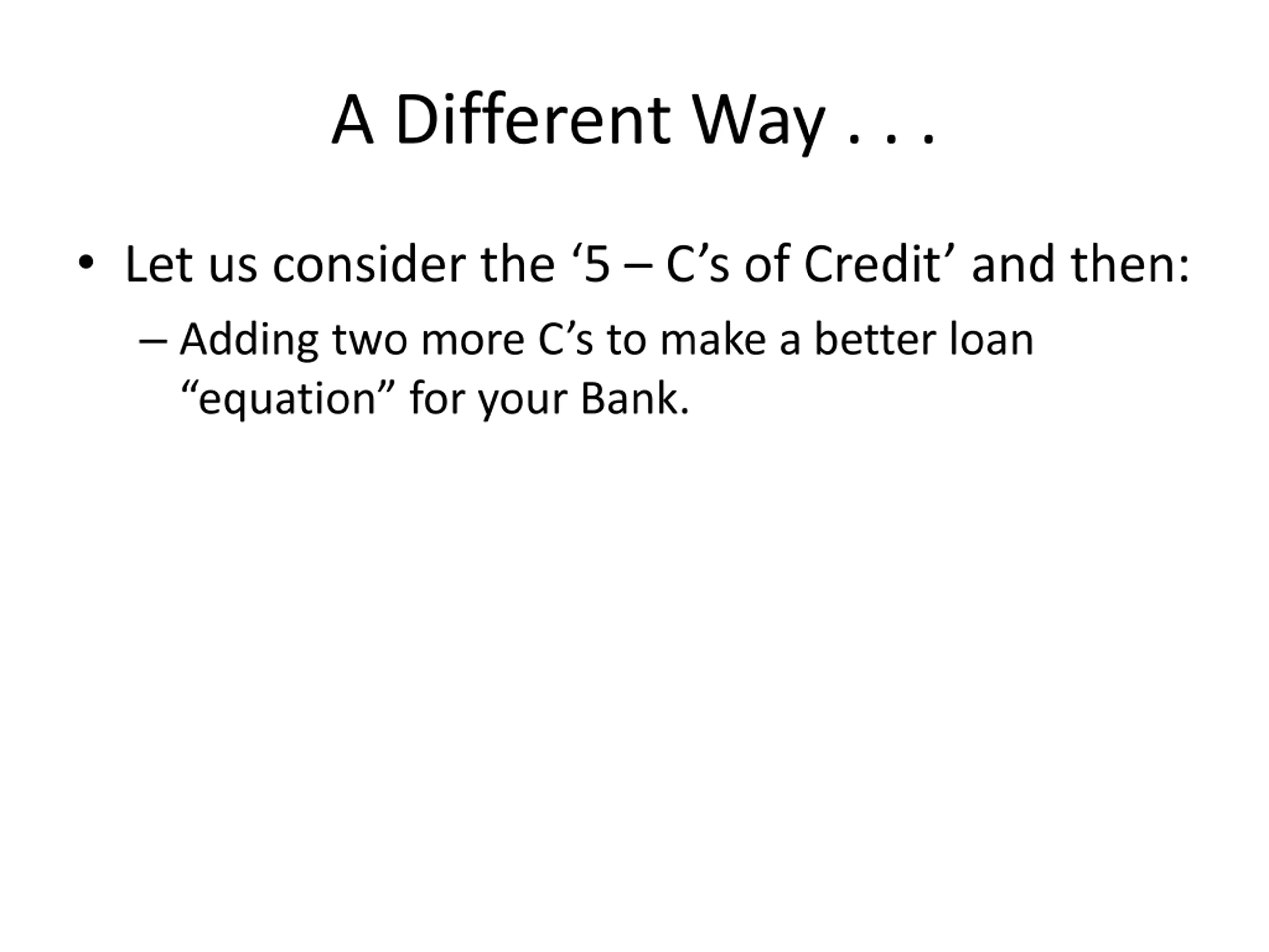 A Different Way . . . Let us consider the 5 C s of Credit and then: Adding two more C s to make a better loan equation for your Bank.