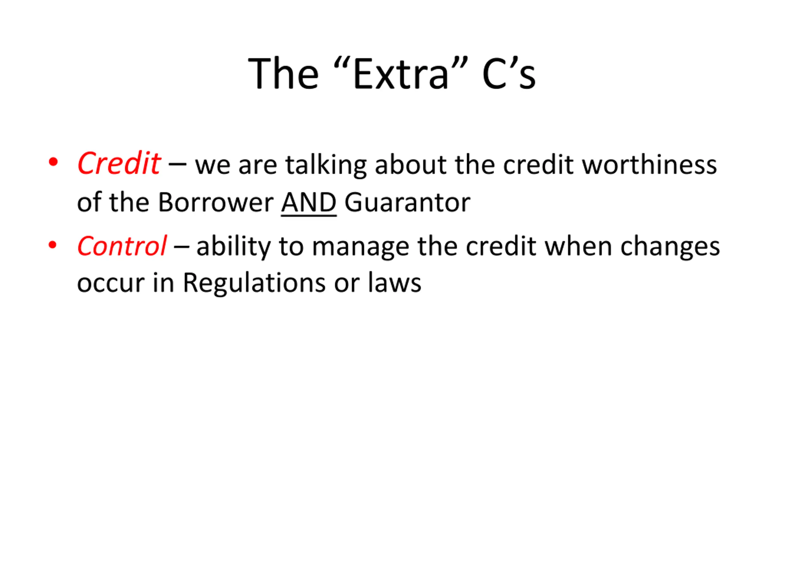 The Extra Cs Credit we are talking about the credit worthiness of the Borrower AND Guarantor Control ability to manage the credit when changes occur in Regulations or laws