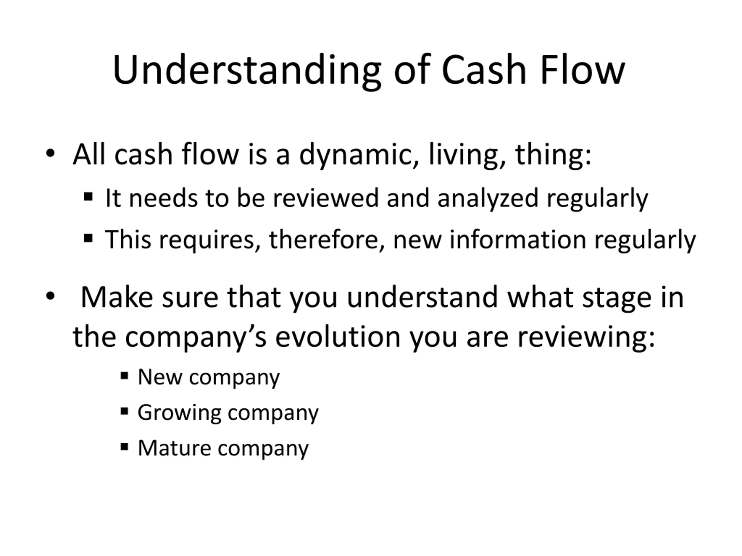 Understanding of Cash Flow All cash flow is a dynamic, living, thing: It needs to be reviewed and analyzed regularly This requires, therefore, new information regularly Make sure that you understand what stage in the company s evolution you are reviewing: New company Growing company Mature company