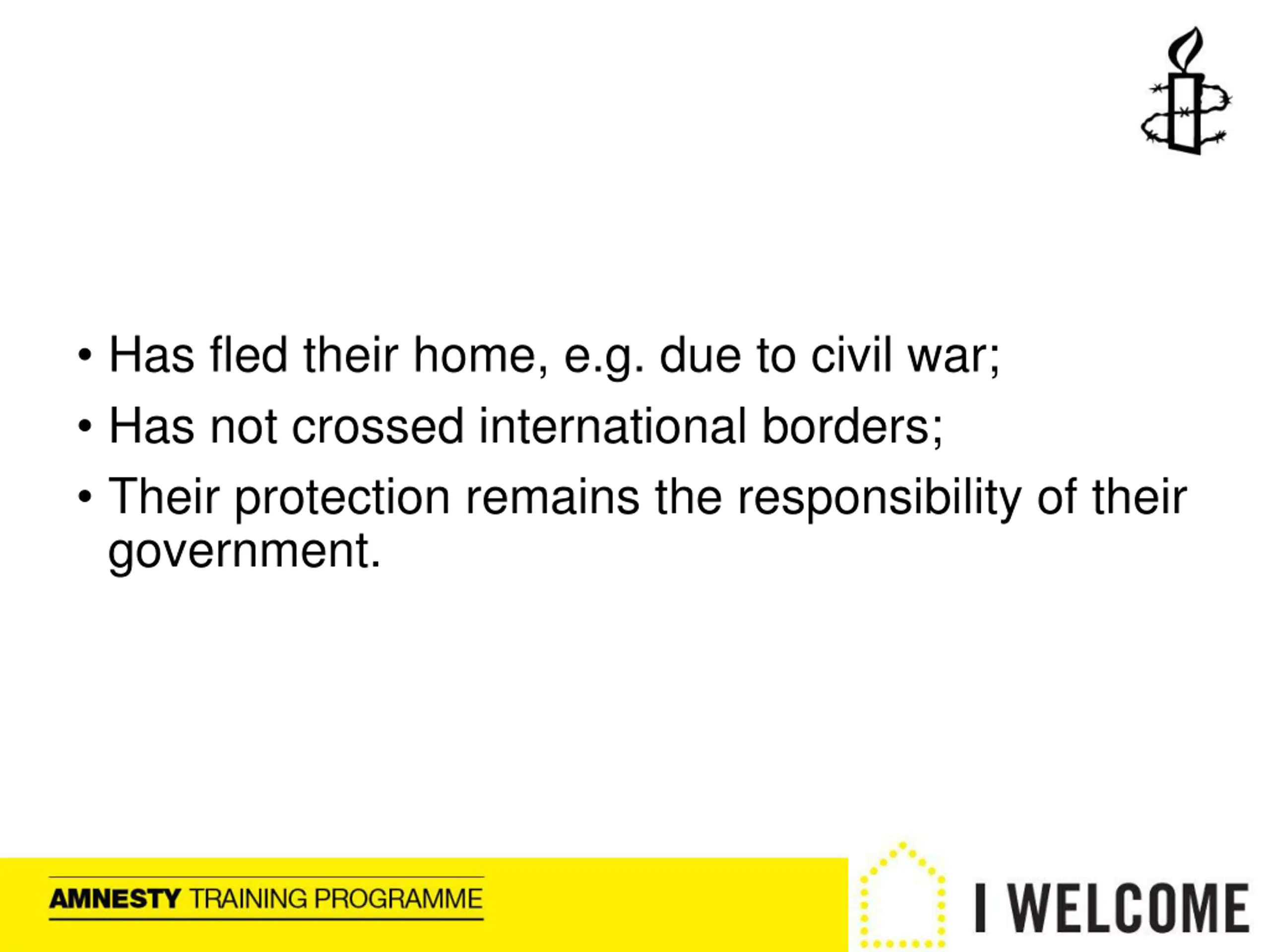 Has fled their home, e.g. due to civil war; Has not crossed international borders; Their protection remains the responsibility of their government.