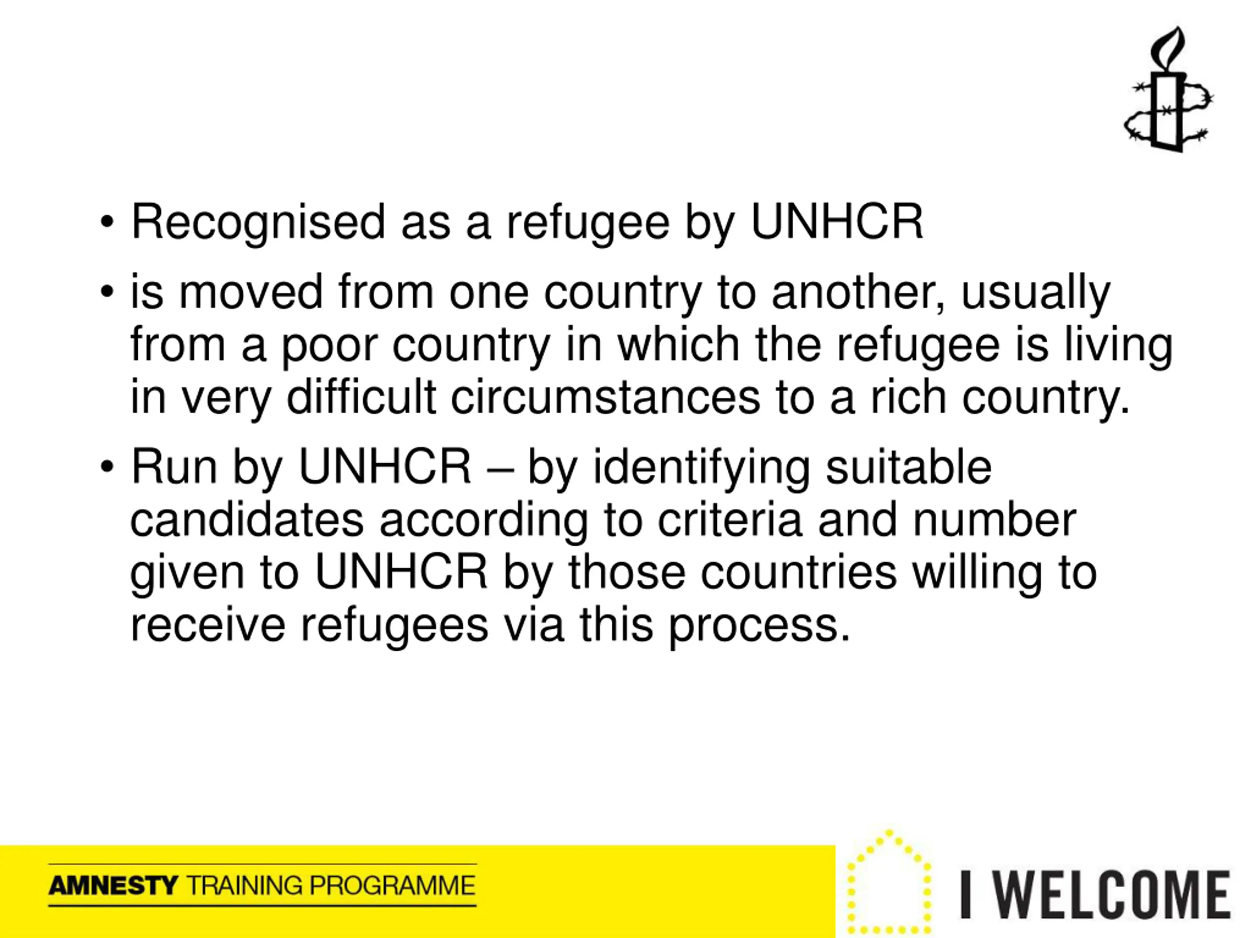 Recognised as a refugee by UNHCR is moved from one country to another, usually from a poor country in which the refugee is living in very difficult circumstances to a rich country. Run by UNHCR by identifying suitable candidates according to criteria and number given to UNHCR by those countries willing to receive refugees via this process.