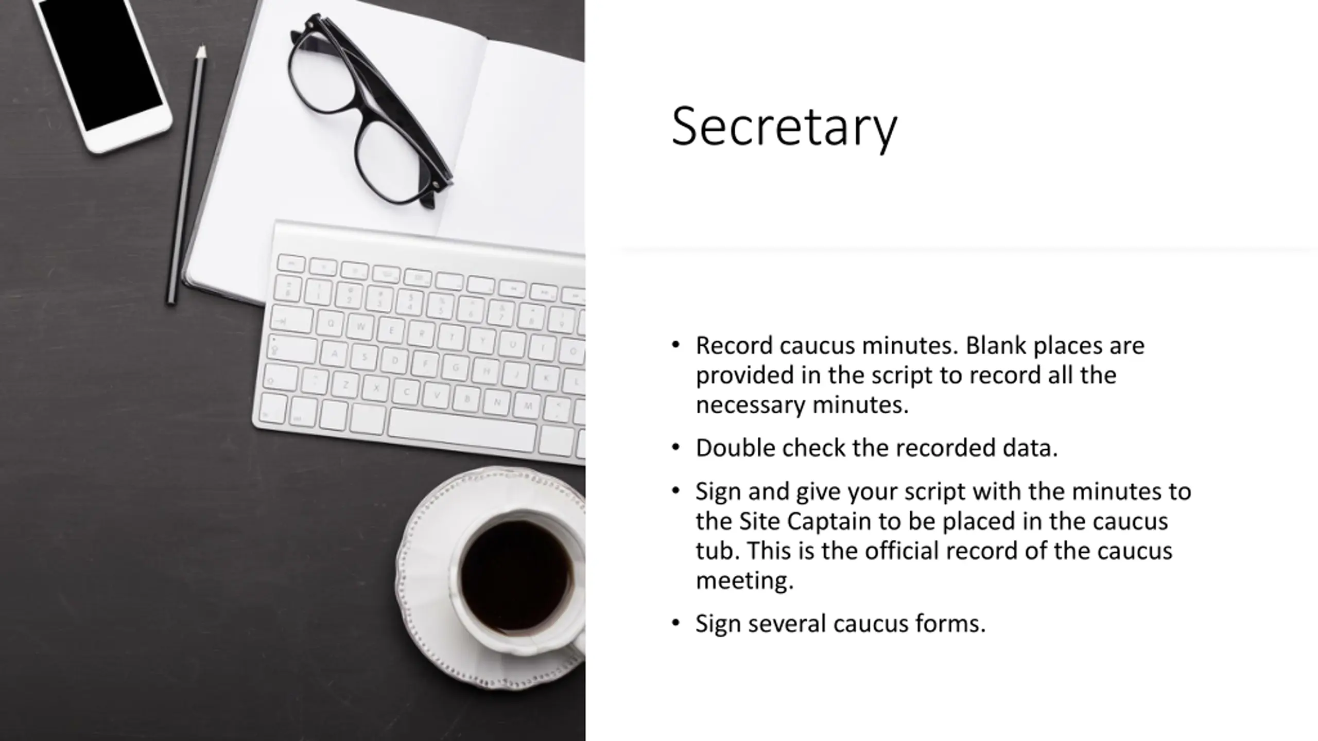 Secretary Record caucus minutes. Blank places are provided in the script to record all the necessary minutes. Double check the recorded data. Sign and give your script with the minutes to the Site Captain to be placed in the caucus tub. This is the official record of the caucus meeting. Sign several caucus forms.