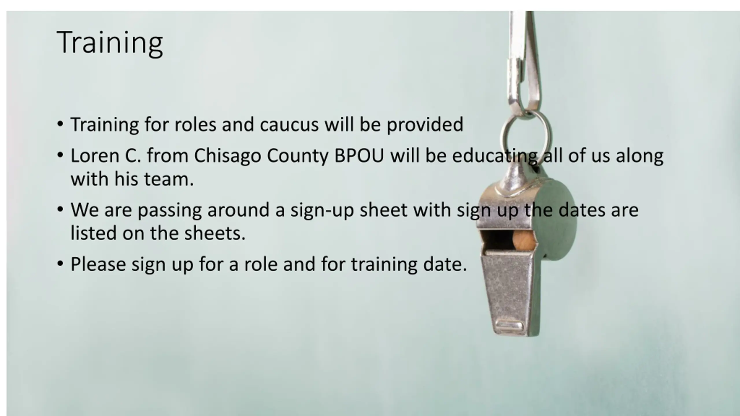 Training Training for roles and caucus will be provided Loren C. from Chisago County BPOU will be educating all of us along with his team. We are passing around a sign-up sheet with sign up the dates are listed on the sheets. Please sign up for a role and for training date.