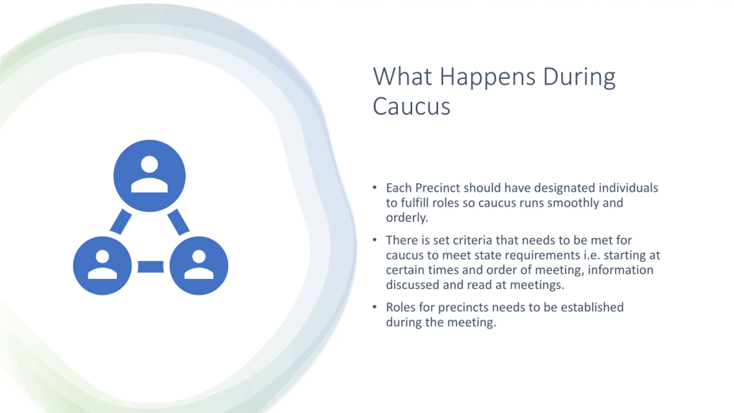 What Happens During Caucus Each Precinct should have designated individuals to fulfill roles so caucus runs smoothly and orderly. There is set criteria that needs to be met for caucus to meet state requirements i.e. starting at certain times and order of meeting, information discussed and read at meetings. Roles for precincts needs to be established during the meeting.